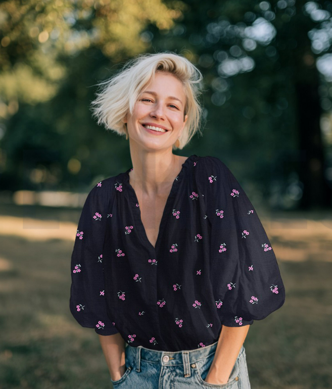 Die kleinen Blümchen sind ein dekoratives Detail, das dem Stoff eine charmante und hochwertige Wirkung verleiht. Dadurch eignet sich der Musselin besonders gut für feminine, romantische und moderne Nähideen. Die Farbkombination aus Marineblau und Rosa wirkt freundlich, edel und zugleich gut kombinierbar.