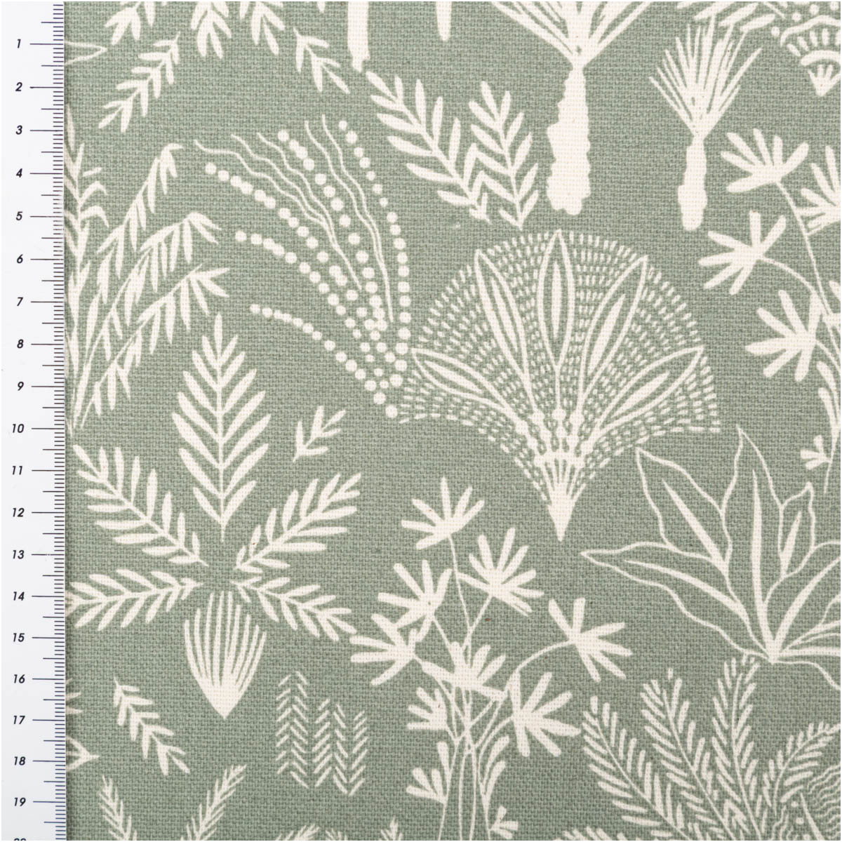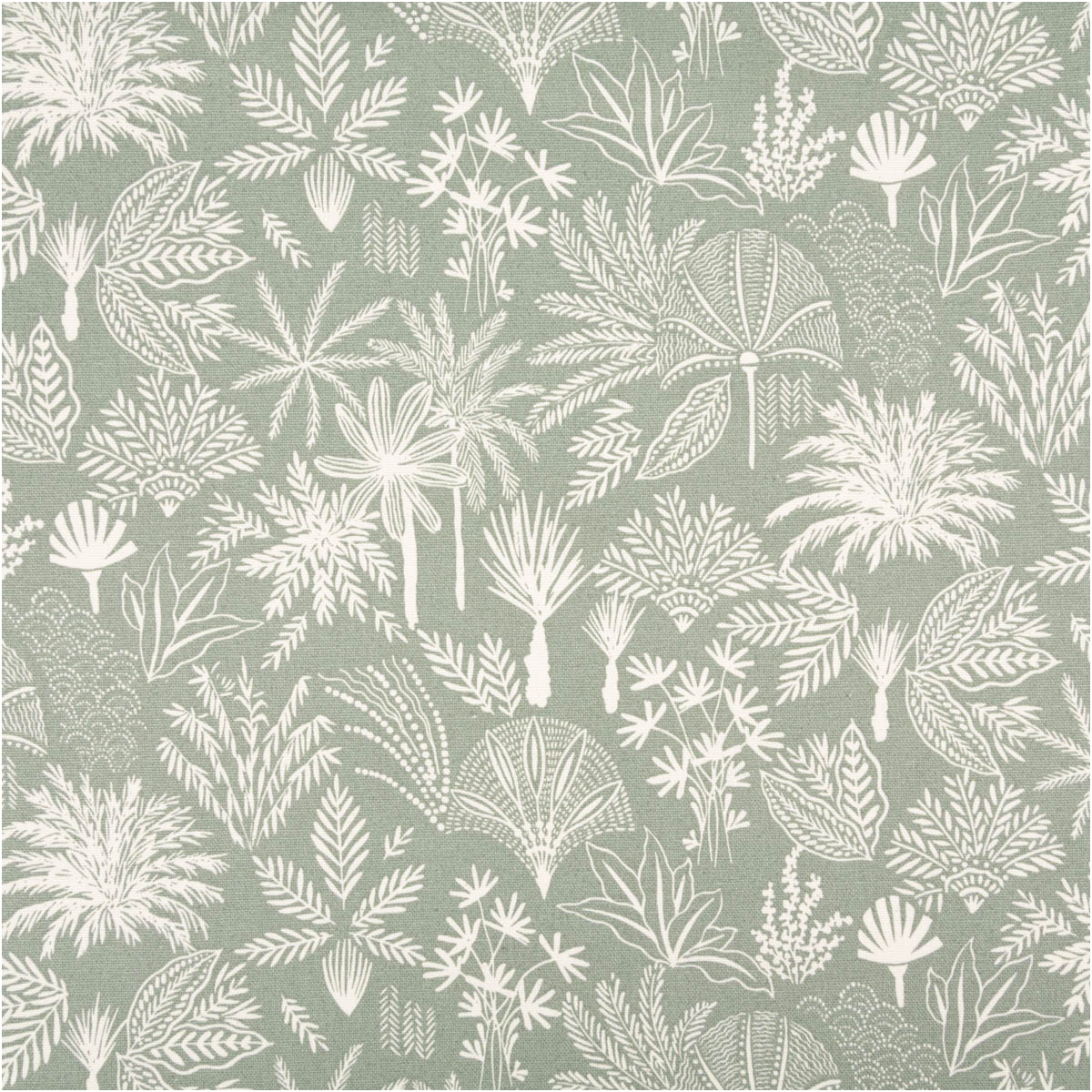 Natürliches Pflanzen-Dessin – Exotische Palmen, Blätter & Pflanzen in sanftem Salbei-Grün für ein harmonisches Wohnambiente. Ein exklusives Dessin aus Frankreich.
