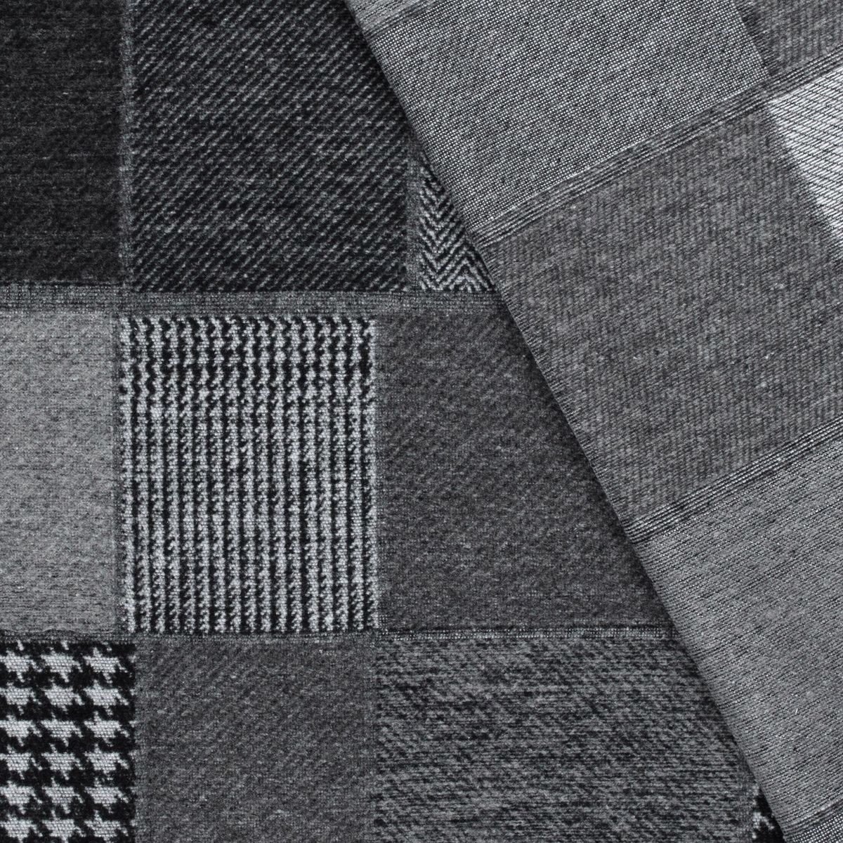 Kuscheliger Jacquard-Mantelstoff mit Patchwork-Karo in eleganten Grau-Nuancen. Die gebürstete Seite macht den Stoff extra weich und wärmend – perfekt für stylische Outerwear und cozy Home-Projekte.