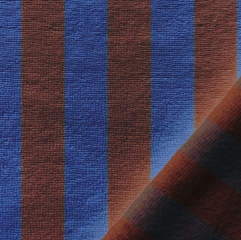 Dieser hochwertige Frottee Stoff mit markanten Blockstreifen in Blau und Braun verbindet Komfort, Funktionalität und modernes Design. Dank der cleveren Doubleface-Verarbeitung kannst du beide Seiten des Stoffes nutzen: eine dekorative Streifenseite und eine ruhige, unifarbene Rückseite in harmonischen Rottönen. Ideal für vielseitige Nähprojekte rund um Bad, Wellness und Familie.
