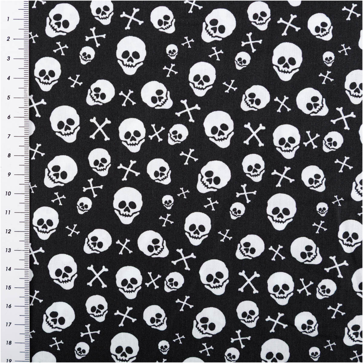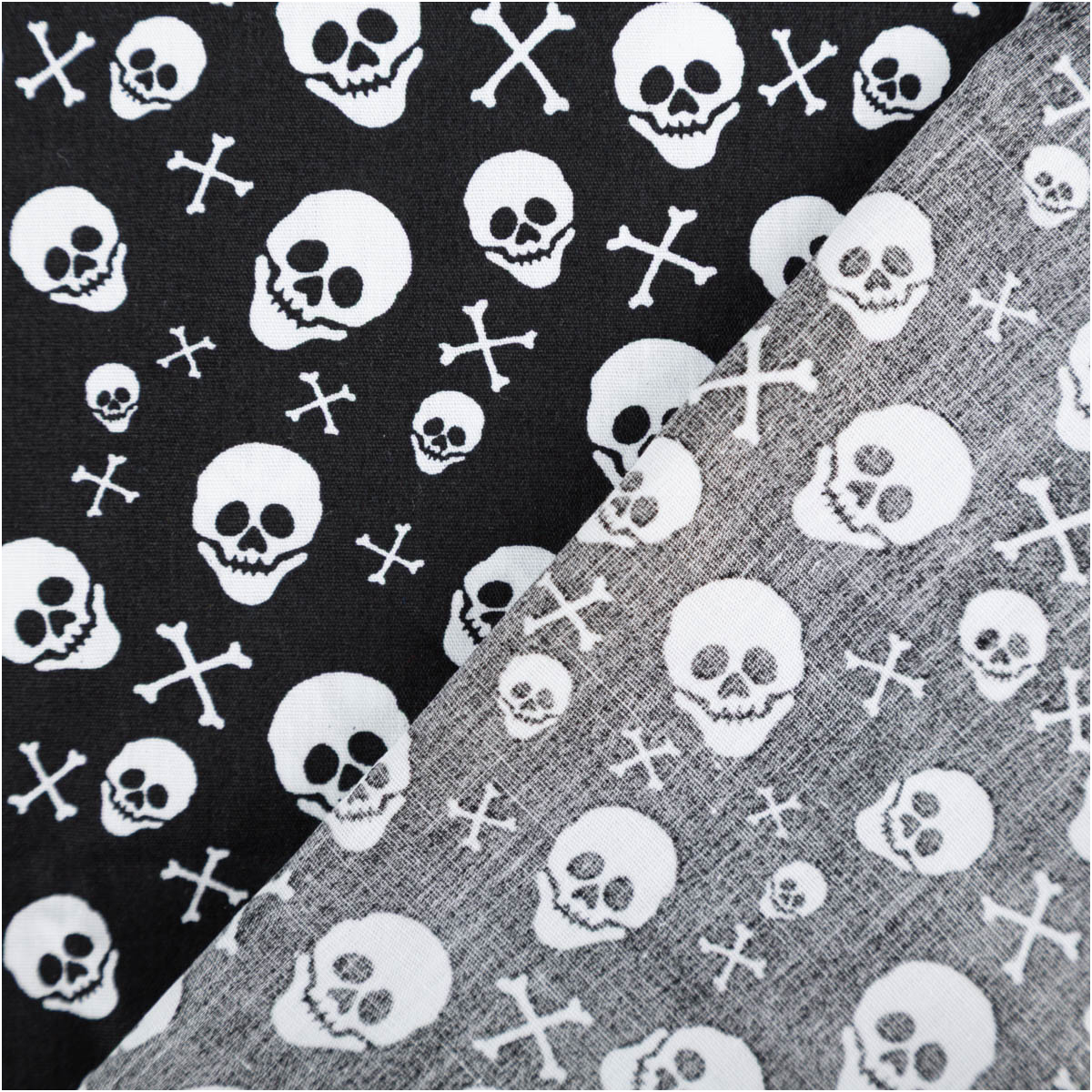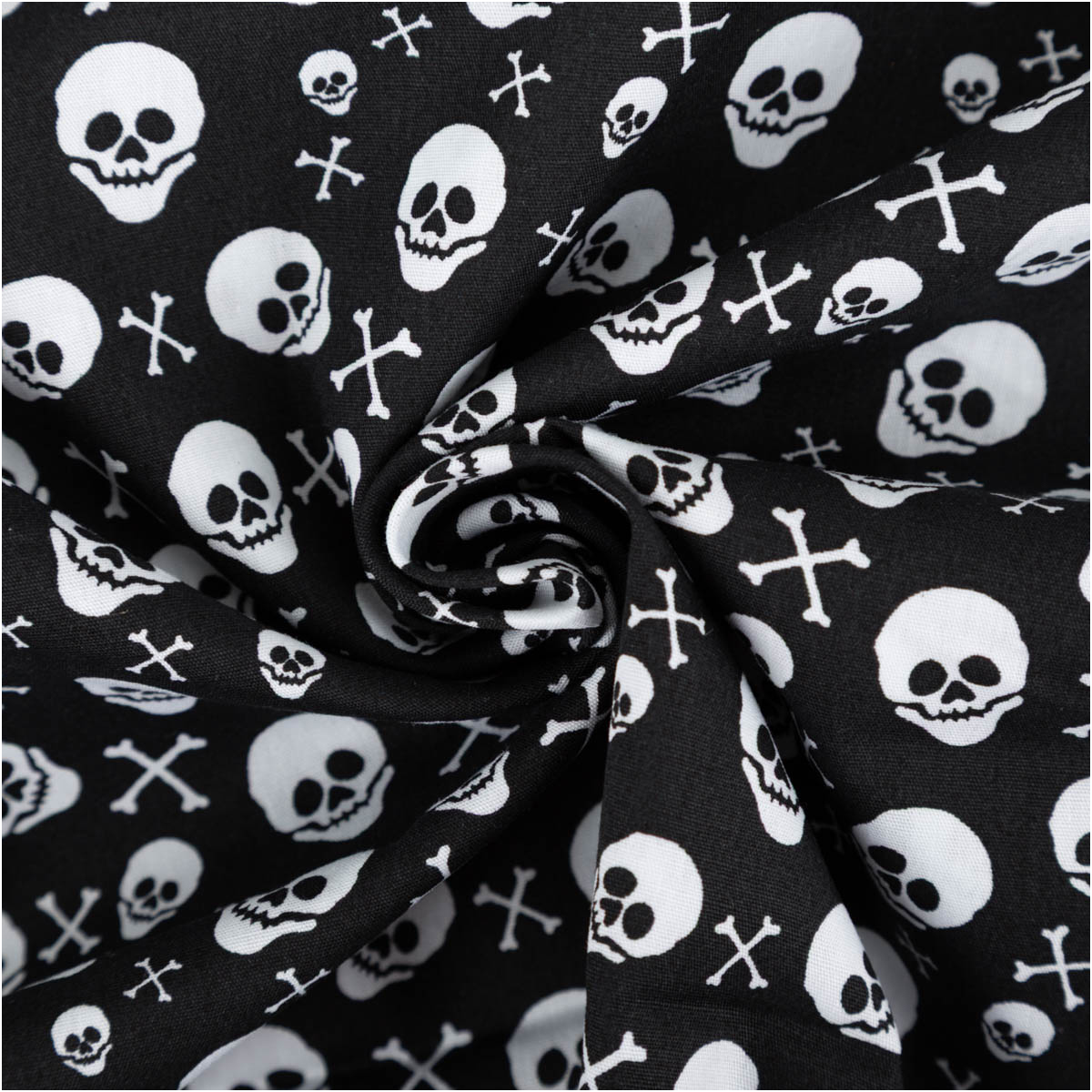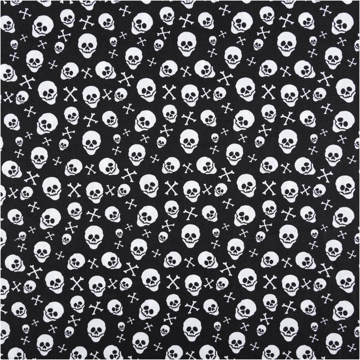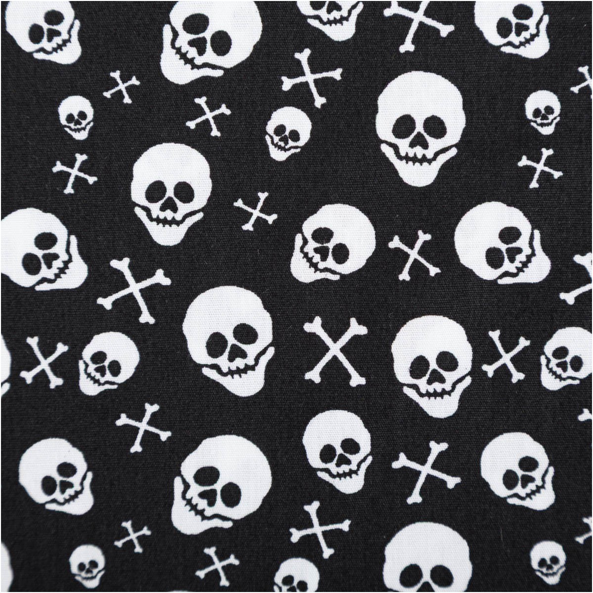 Baumwollstoff mit weißen Totenköpfen und Knochen auf schwarzem Grund