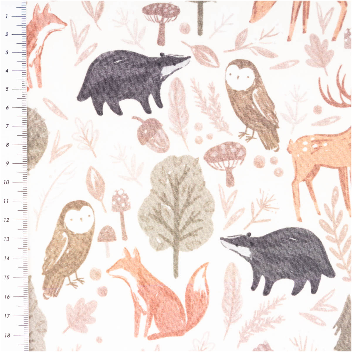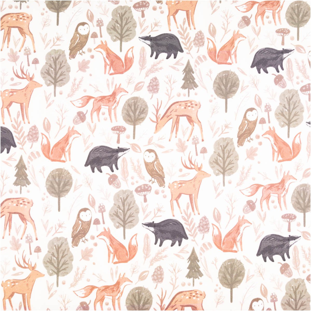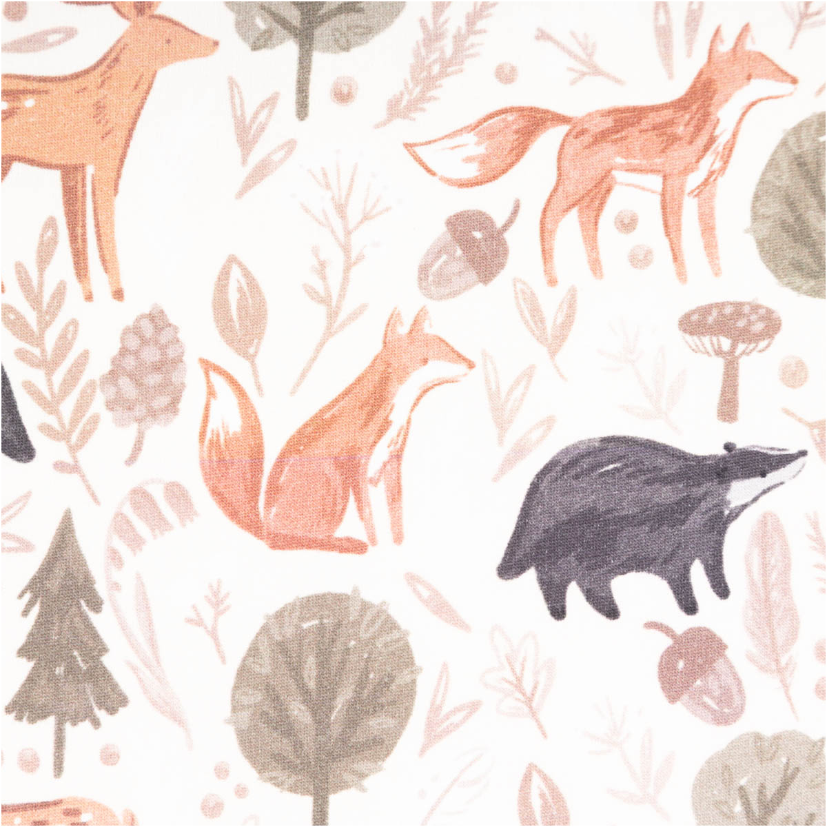 Dieser kuschelweiche Sweatstoff aus der Poppy Fabrics Kollektion ist ein echter Blickfang: liebevoll gestaltete Waldtiere wie Füchse, Eulen, Hirsche und Dachse tummeln sich zwischen Bäumen, Blättern und Pilzen auf hellem Hintergrund in Offwhite – detailreich im hochwertigen Digitaldruck umgesetzt.