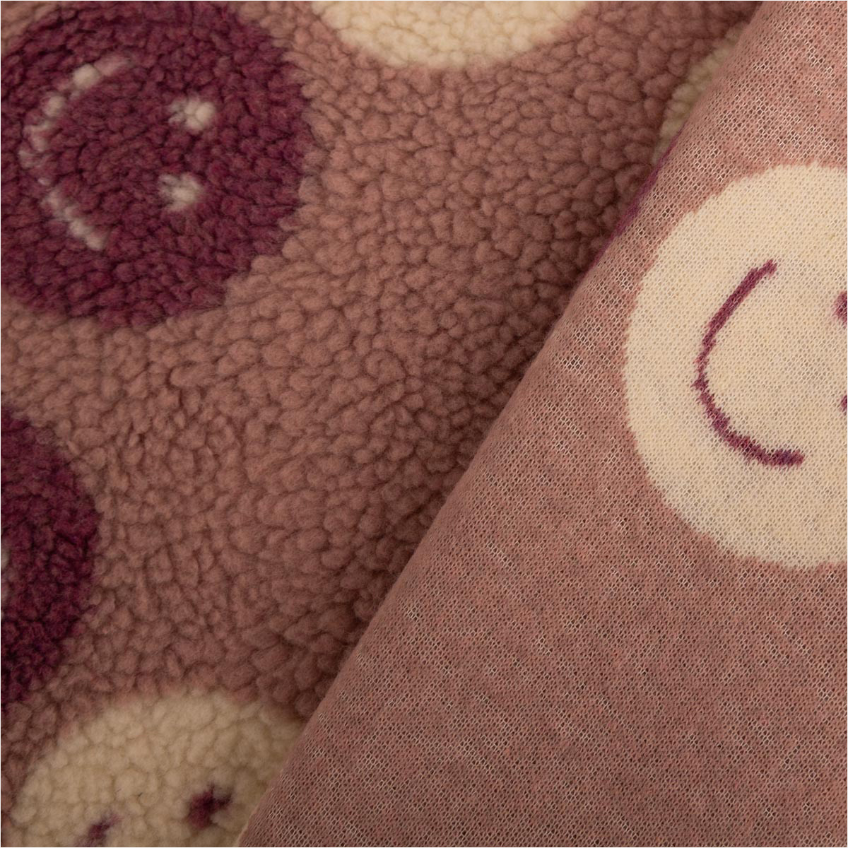 Teddystoff Bouclé „Happy Faces“ lila/wollweiß – 160 cm Breite, kuschelweich