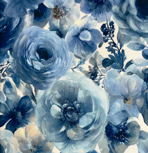 Das florale Design mit großen, aquarellartigen Rosen wirkt besonders stilvoll und ruhig. Die verschiedenen Blaunuancen von hell bis dunkel verleihen dem Stoff eine edle, harmonische Ausstrahlung. Der Digitaldruck bringt feine Farbverläufe und Details optimal zur Geltung und macht den Stoff zu einem echten Blickfang.