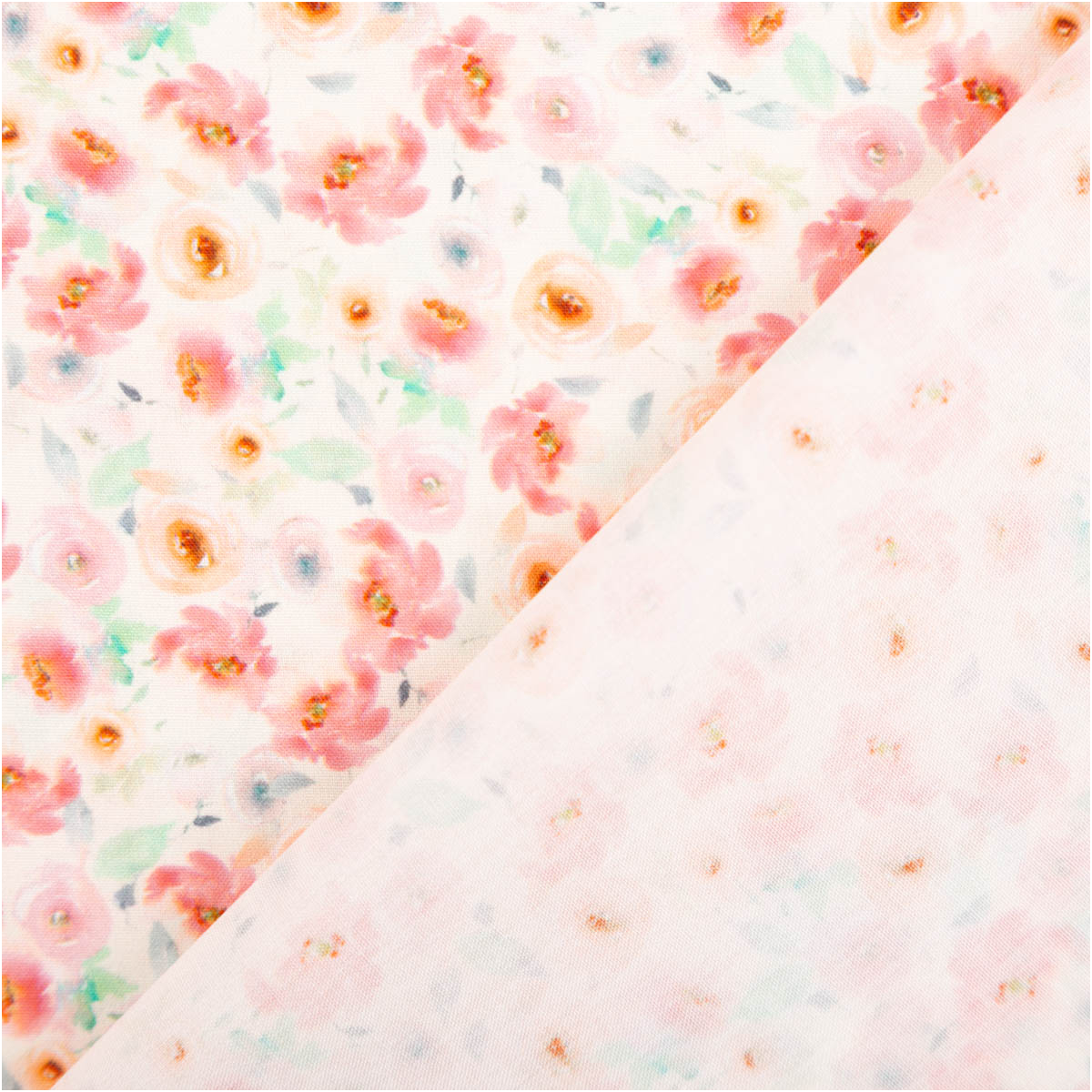 Die helle Grundfarbe in Ecru sorgt für eine freundliche, sommerliche Ausstrahlung, während die kleinen Blüten in Rosa und Grün dem Stoff Lebendigkeit und Frische verleihen. Ideal für alle, die leichte Stoffe mit einer dezenten, stilvollen Optik lieben.