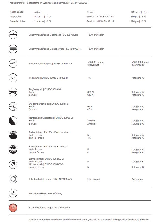 - Scheuertouren: 50.000 Touren (100.000 Martindale)