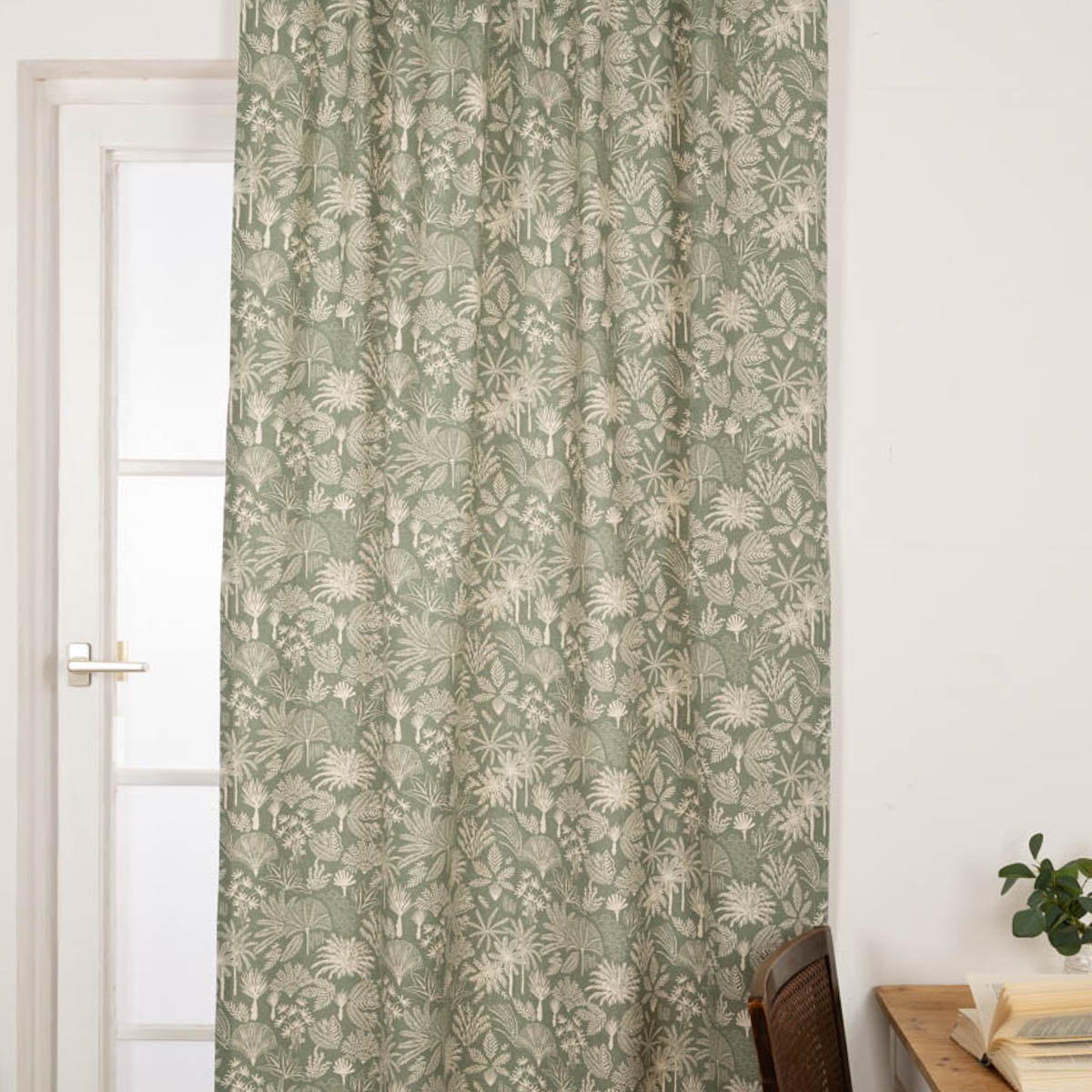 Exklusiver-Print: Das natürliche Dessin mit exotischen Blättern, Palmen und Pflanzen in Salbei-Grün ist ein einzigartiger Hingucker für deine Fenster.