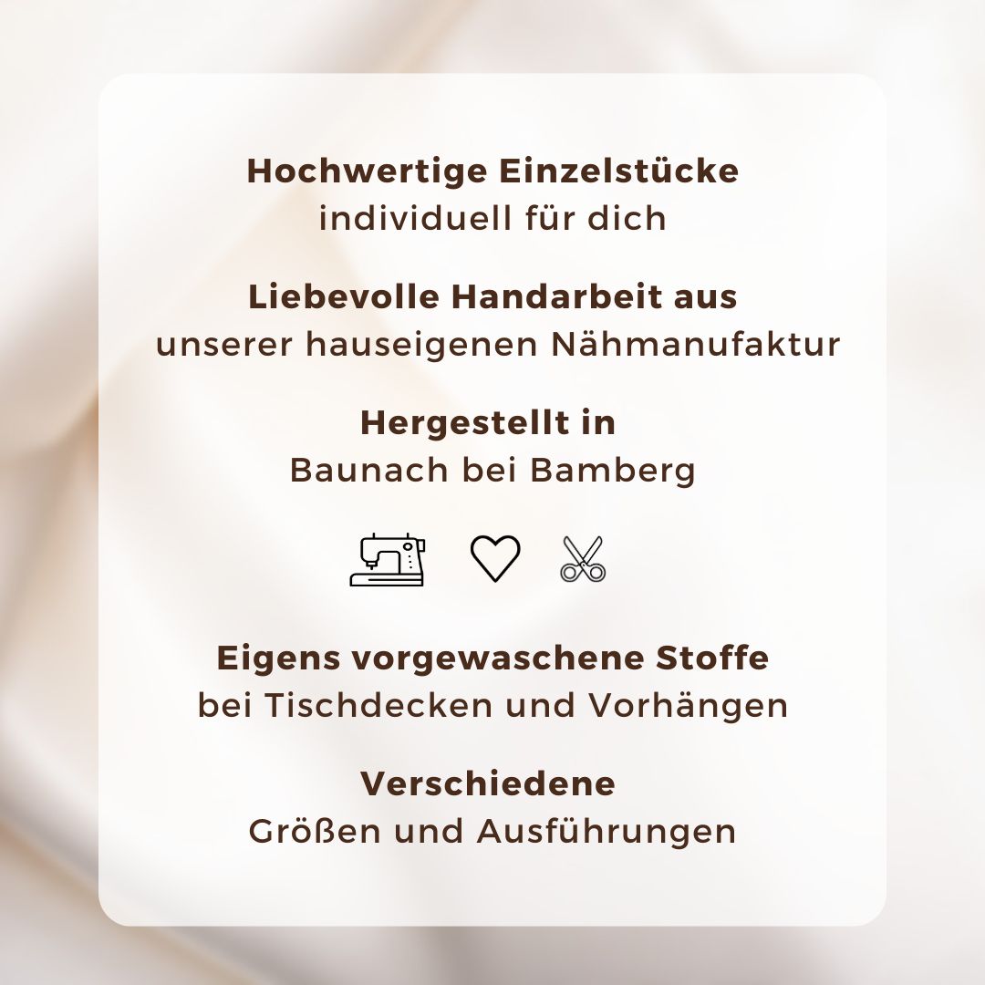 In unserer Heimtextilien Manufaktur in Deutschland wird dein Vorhang mit viel Liebe und Sorgfalt von Hand gefertigt. Du unterstützt mit deinem Kauf nicht nur die lokale Wirtschaft, sondern sicherst dir auch ein Produkt, das unter fairen Arbeitsbedingungen entstanden ist. Wir sind stolz darauf, dass wir erfahrene Näherinnen haben, die alle unsere Lieblingsstücke sorgfältig herstellen. Dein Vorhang ist daher ein Unikat, das in liebevoller Handarbeit gefertigt wurde.
