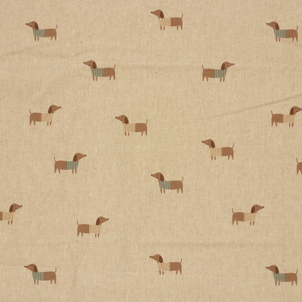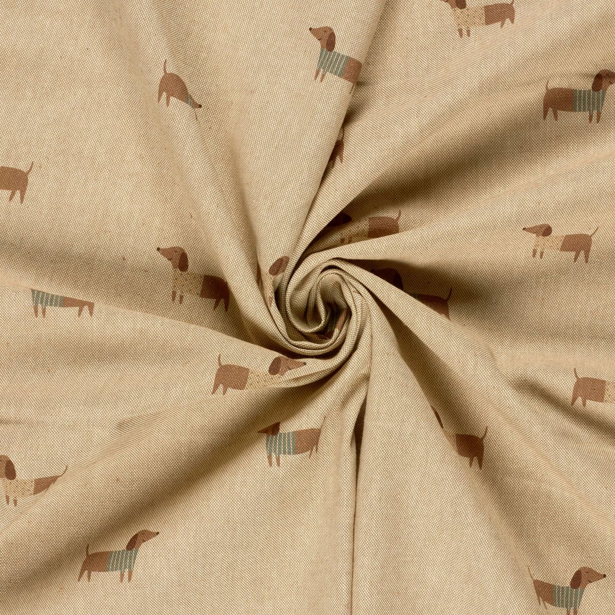 Blickdichter Dekostoff in Leinenoptik mit liebevollem Dackel-Print in warmen Naturtönen für eine gemütliche und natürliche Wohnatmosphäre