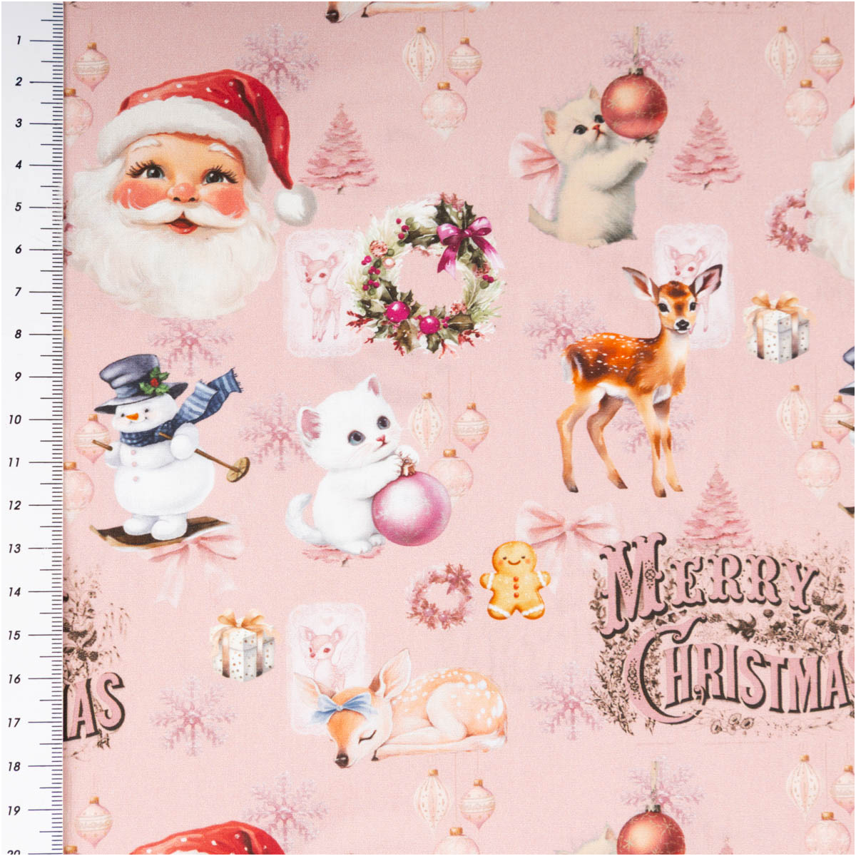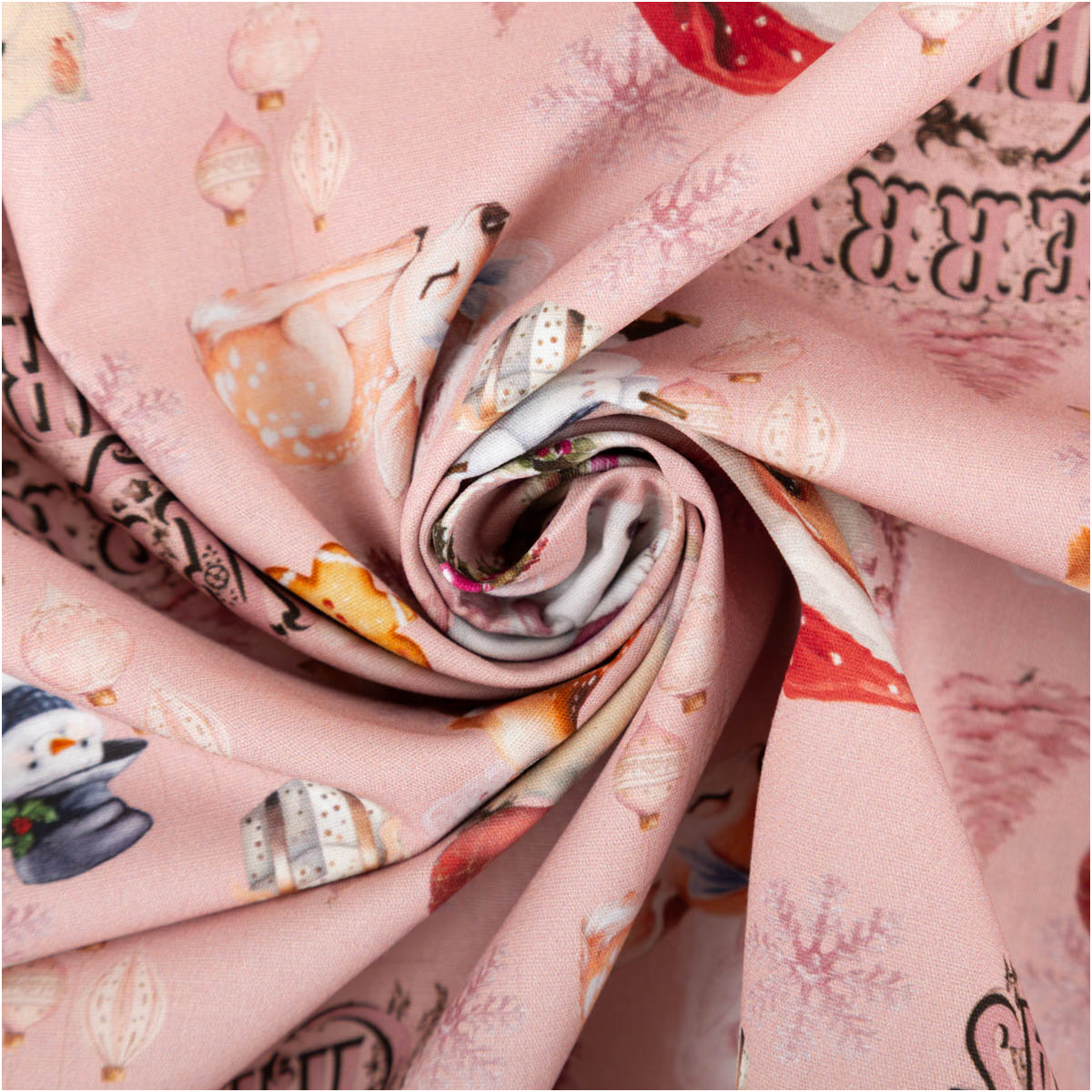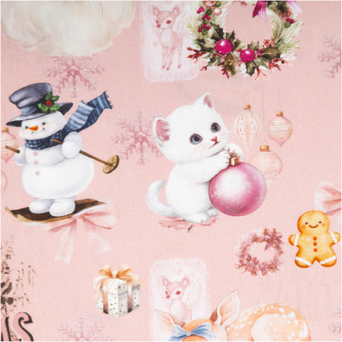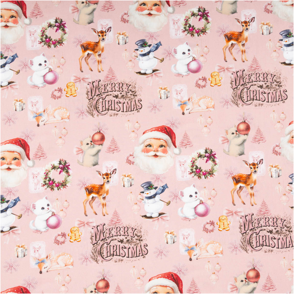 Festliche Nostalgie: Weihnachtlicher Popeline-Stoff mit Santa, Reh, Schneemann & Kranz-Motiven auf zartem Rosaton