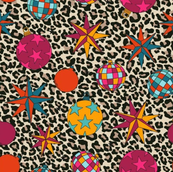 Trend: Leo-Print mit bunten Weihnachtskugeln und Sternen
