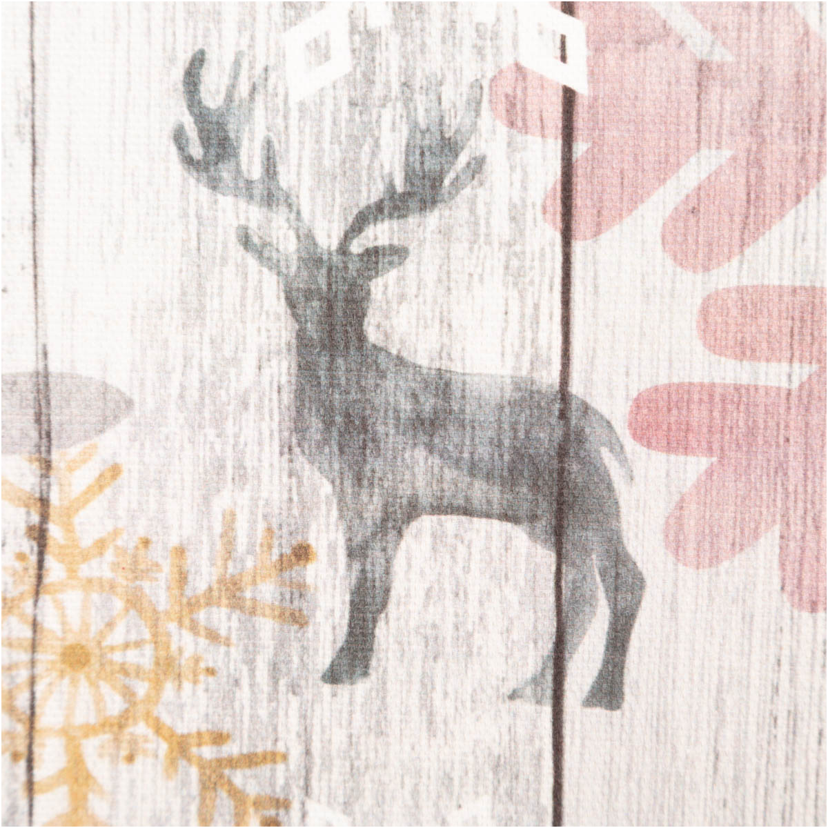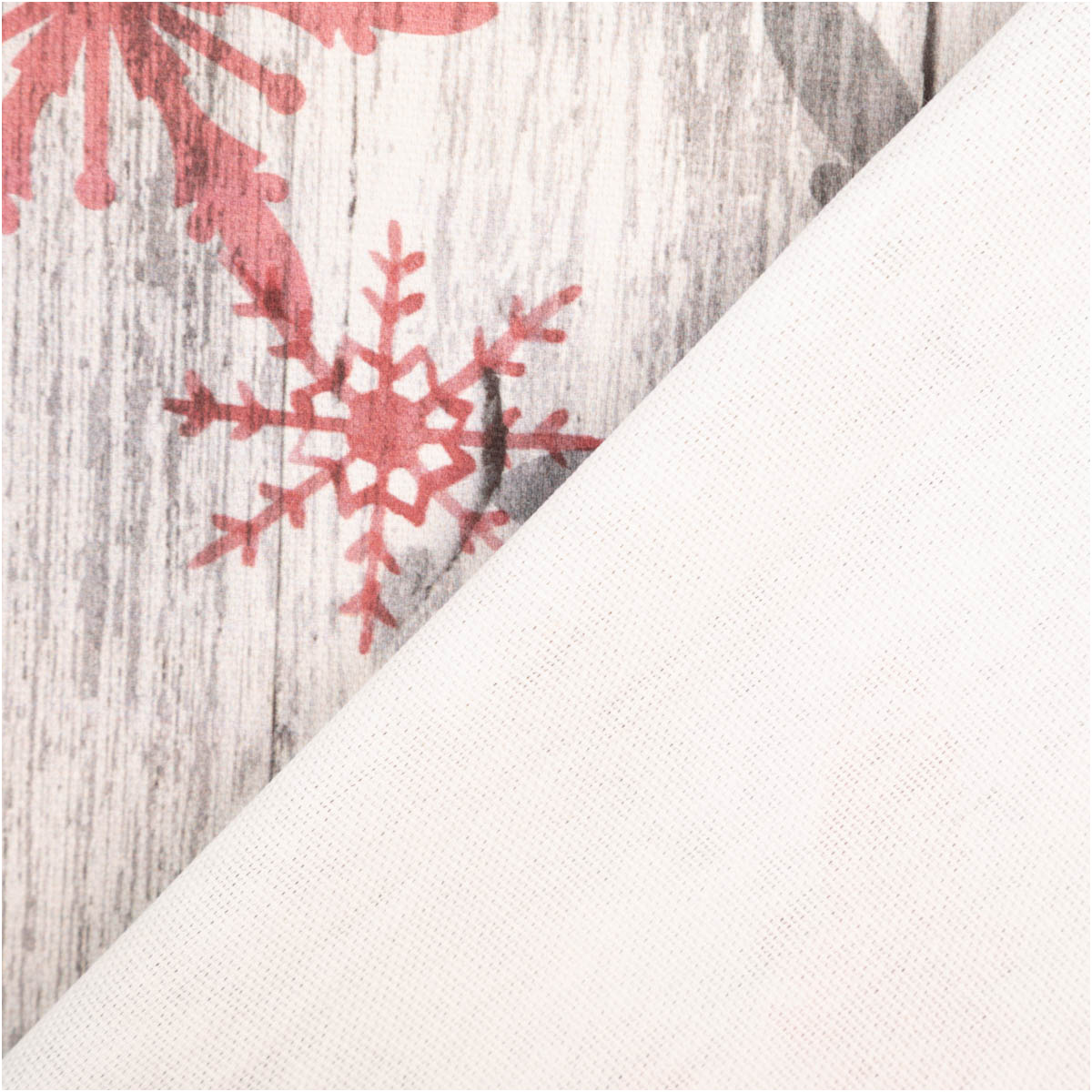 Hochwertiger Baumwollstoff Halbpanama mit Digitaldruck in Holzlattenoptik, Hirschen und Schneekristallen in Grau-Rot