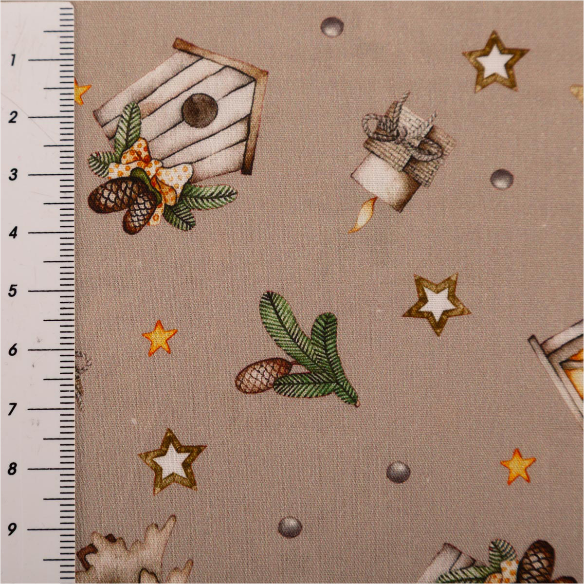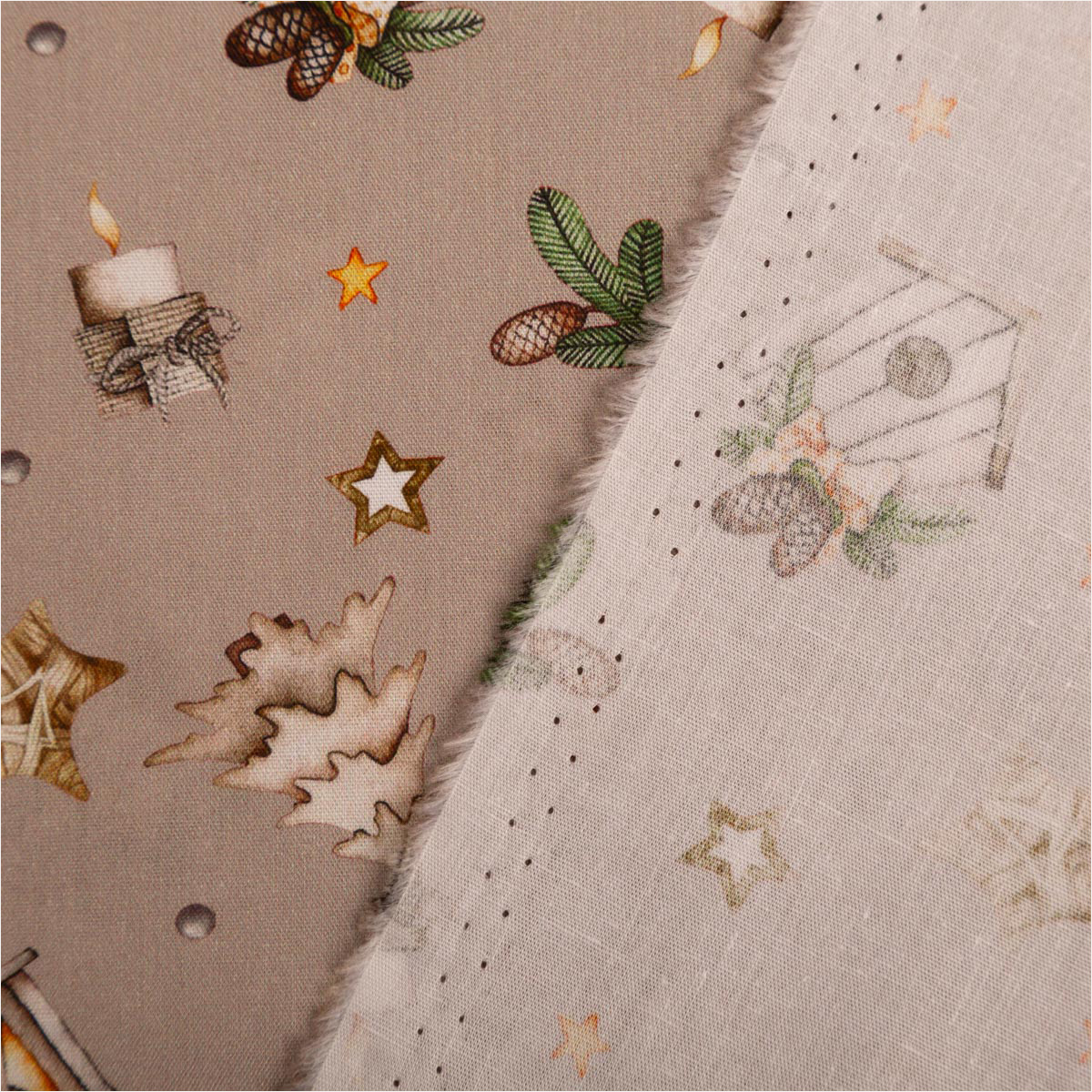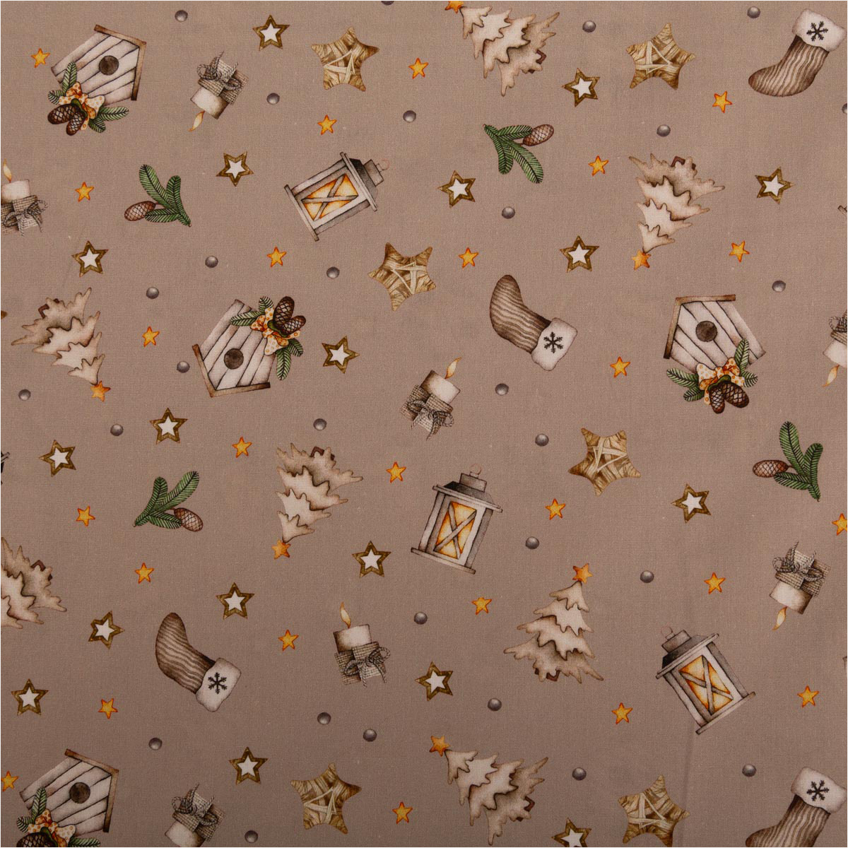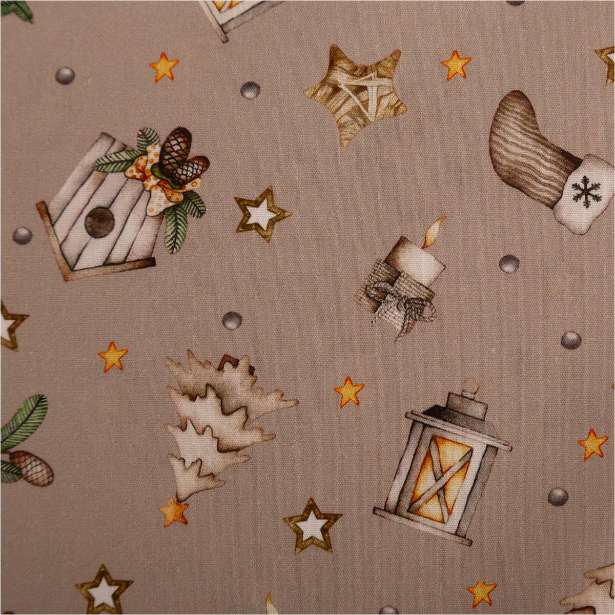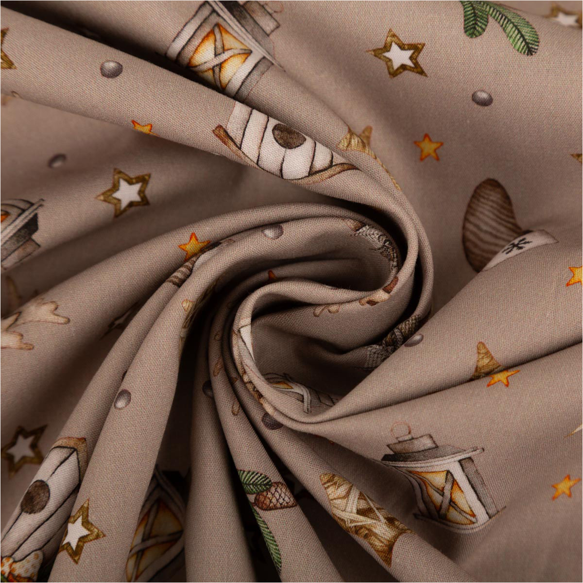 Du suchst einen fein gewebten Baumwollstoff für festliche Projekte? Diese Popeline in dezentem Beige bringt Laternen, Sterne, Tannen, Vogelhäuschen, Zapfen und Mützchen als Allover-Dessin auf deine Nähmaschine – perfekt für Deko, Accessoires und leichte Bekleidung.