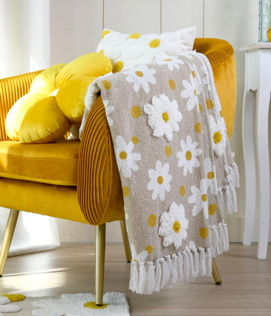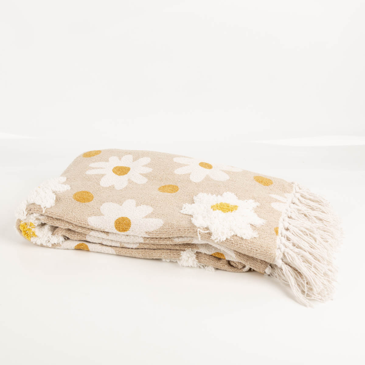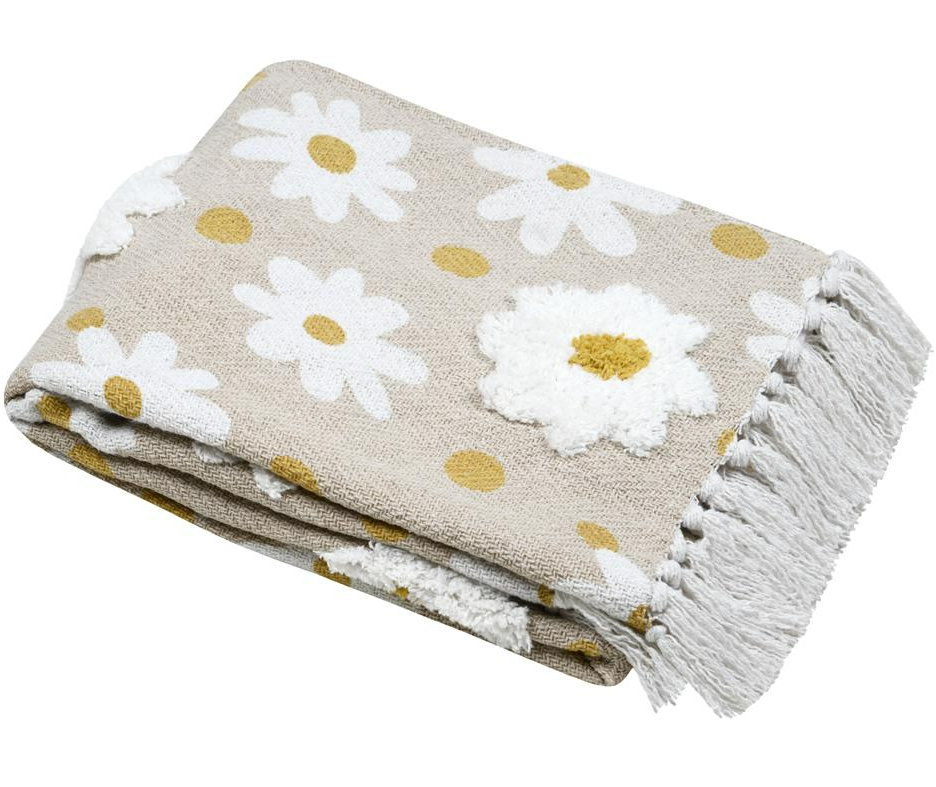 Getuftete Plaid-Decke mit Gänseblümchen-Motiv in Natur, Gelb und Weiß