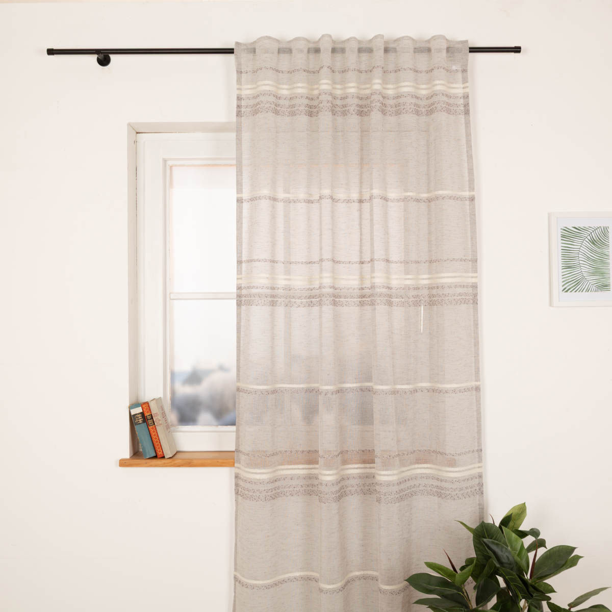Diese Gardine aus transparentem Voile bringt ein ruhiges, modernes Ambiente in dein Zuhause. Die eingewebten grauen und wollweißen Bouclé-Streifen verleihen dem Stoff eine feine, rustikale Struktur, die perfekt zu modernen, skandinavischen und natürlichen Wohnstilen passt. Der grau melierte Voile sorgt für einen sanften Lichteinfall und bietet gleichzeitig einen leichten Sicht- und Blendschutz – ideal für Wohn-, Ess- oder Schlafzimmer.
