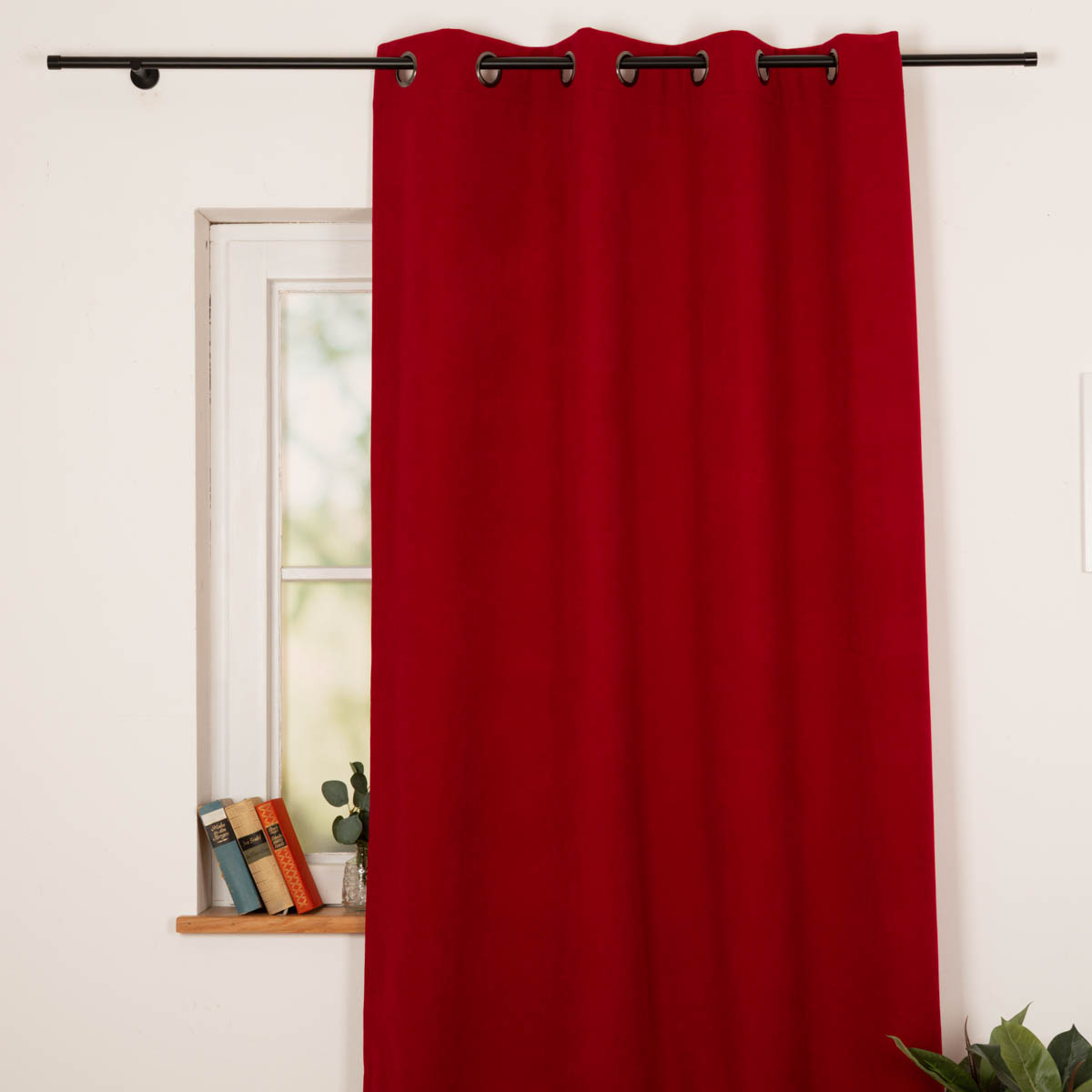 Vorne wurde ein flauschig-weicher, leicht strukturierter Stoff verarbeitet. Der Rotton setzt stilvolle Akzente und wirkt gleichzeitig modern. Die dunkelsilbernen Ösen ergänzen das moderne Design und harmonieren sowohl mit modernen Einrichtungsstilen als auch mit natürlichen Wohnkonzepten.