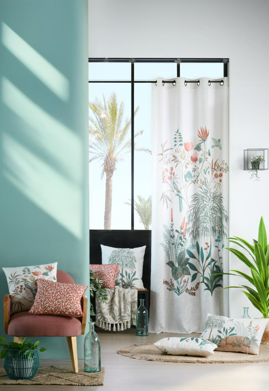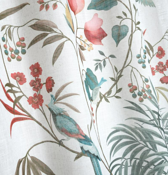 Dieser Ösenvorhang mit detailreichem Vogel- und Blütendessin bringt Leichtigkeit, Natürlichkeit und einen Hauch Exotik in deine Wohnräume. Das exklusive französische Dessin zeigt fein illustrierte Vögel, Blumen, Blüten und Blätter in harmonischen Natur- und Bunttönen und sorgt für eine freundliche, wohnliche Atmosphäre. Ideal für Wohnzimmer, Schlafzimmer oder Essbereich.