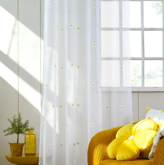 Gleichzeitig sorgt die Blütenstickerei dafür, dass das Fenster nicht schlicht wirkt, sondern eine dekorative und wohnliche Note erhält.