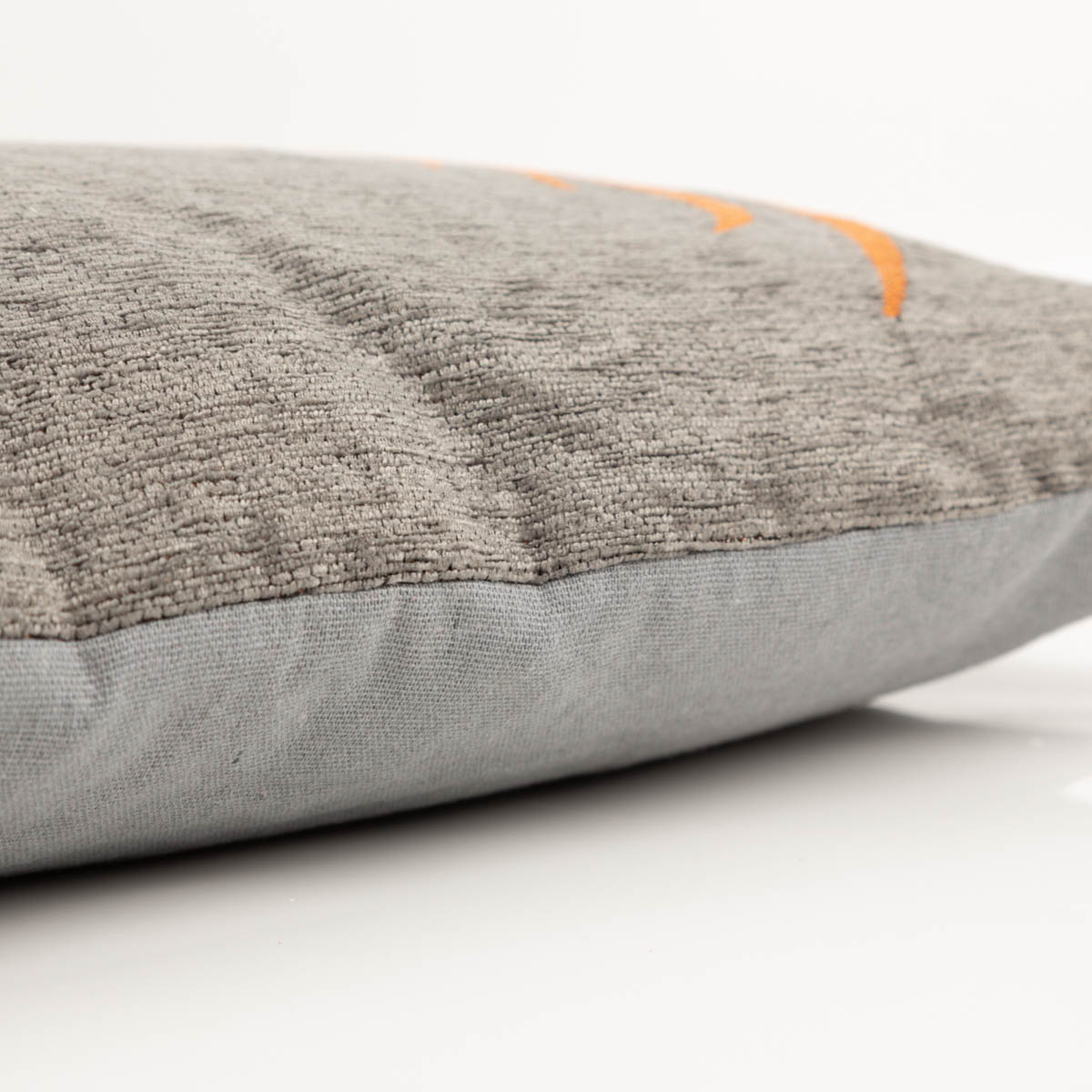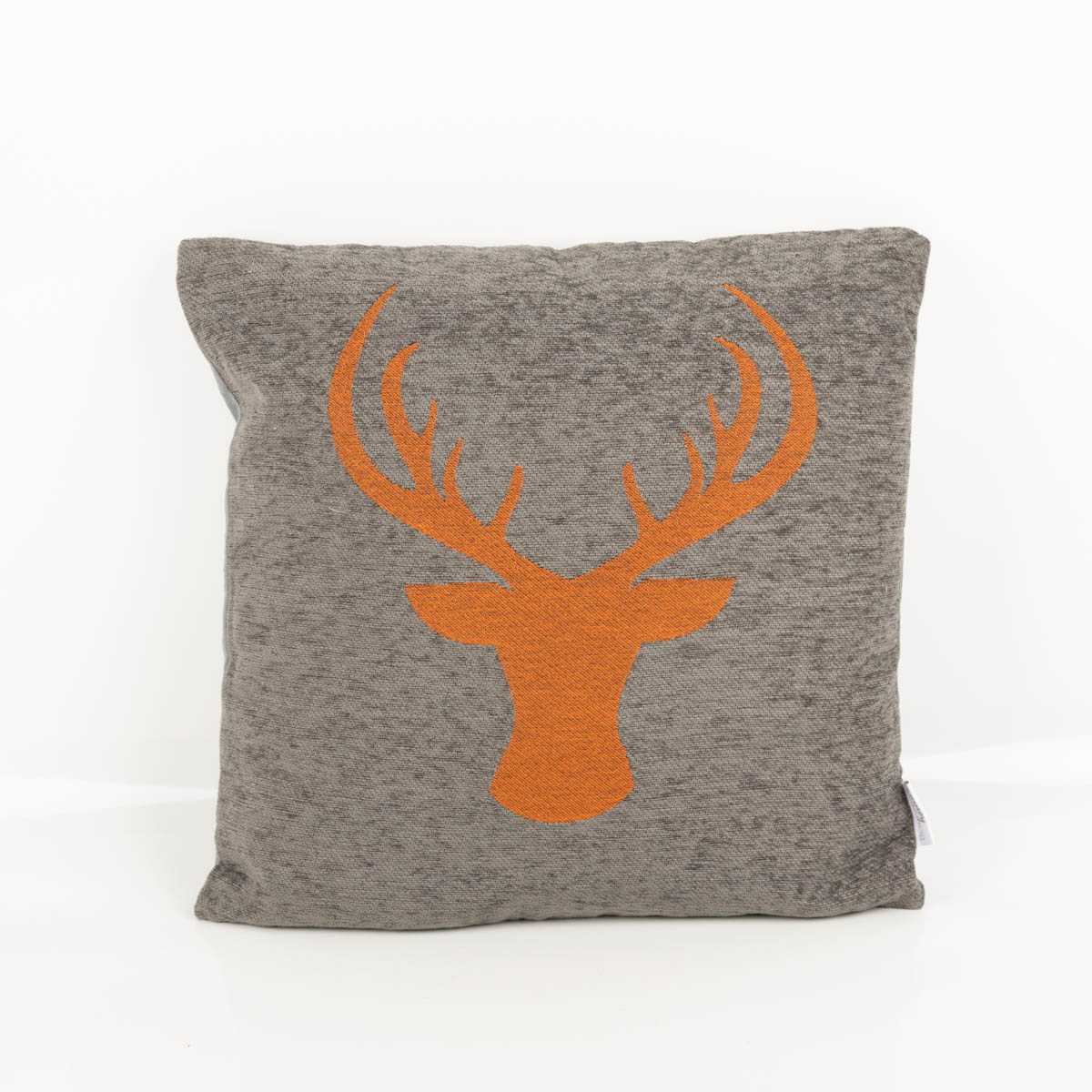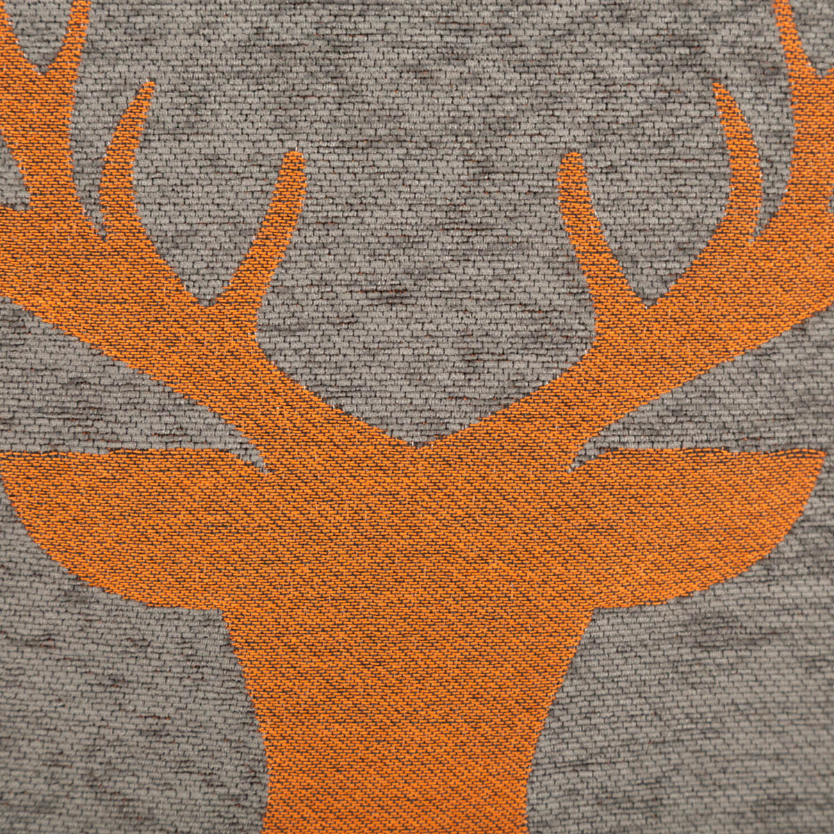 Die Vorderseite begeistert mit einem eingewebten Hirschkopf-Motiv auf weichem Chenillegewebe. Das sorgt für eine angenehme, wohnliche Optik und verleiht dem Kissen eine besondere Struktur. Die Farbkombination aus Grau und Orange wirkt warm, harmonisch und dekorativ, ohne zu unruhig zu sein.