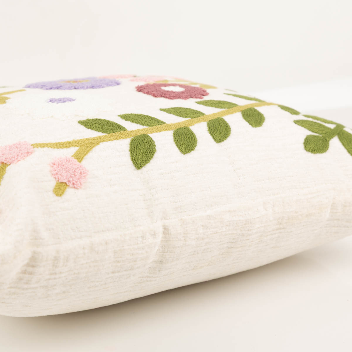 Kissen Blumen aus Chenille in Wollweiß, Grün, Rosa und Lila