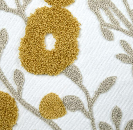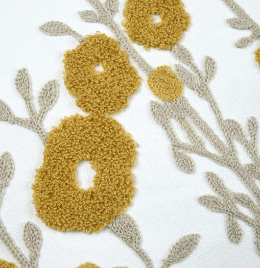 Durch das Zusammenspiel aus Tuftung und Stickerei wirkt das Kissen lebendig und hochwertig. Gerade auf einfarbigen Sofas oder in Kombination mit weiteren Naturtönen kommt das florale Motiv besonders schön zur Geltung.