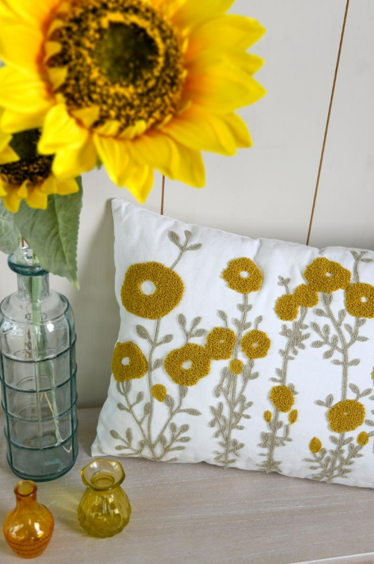 Du suchst ein Kissen, das freundlich, natürlich und dekorativ wirkt? Dieses rechteckige Kissen in 40 x 60 cm verbindet eine ruhige Grundfarbe in Wollweiß mit getufteten Blüten in Gelb und fein gestickten Blättern und Stielen in Beige. So entsteht ein florales Design, das Wärme ausstrahlt und gleichzeitig angenehm zurückhaltend bleibt.