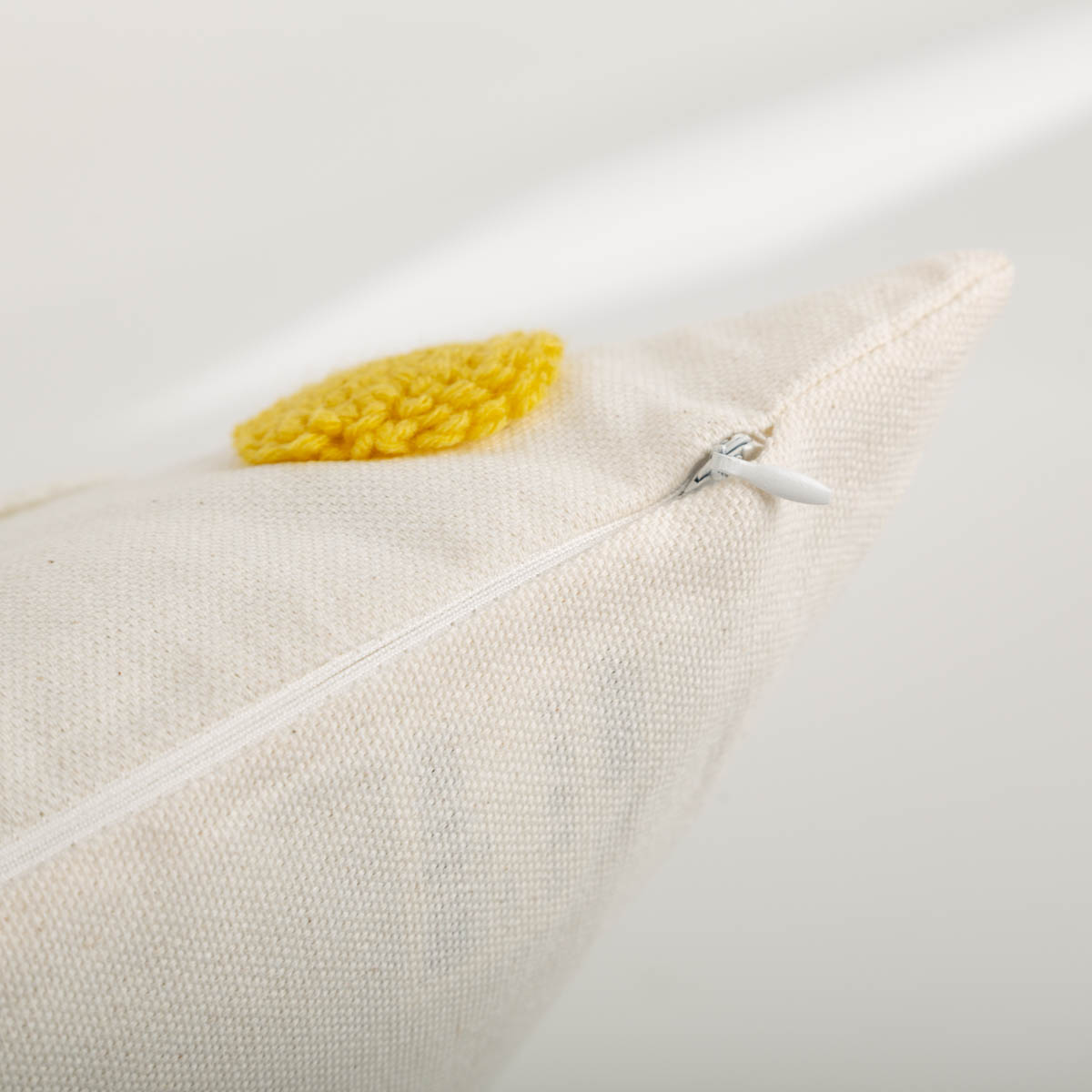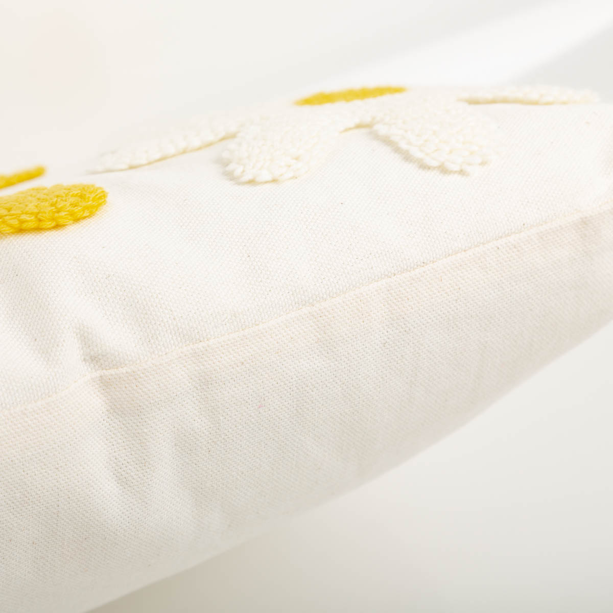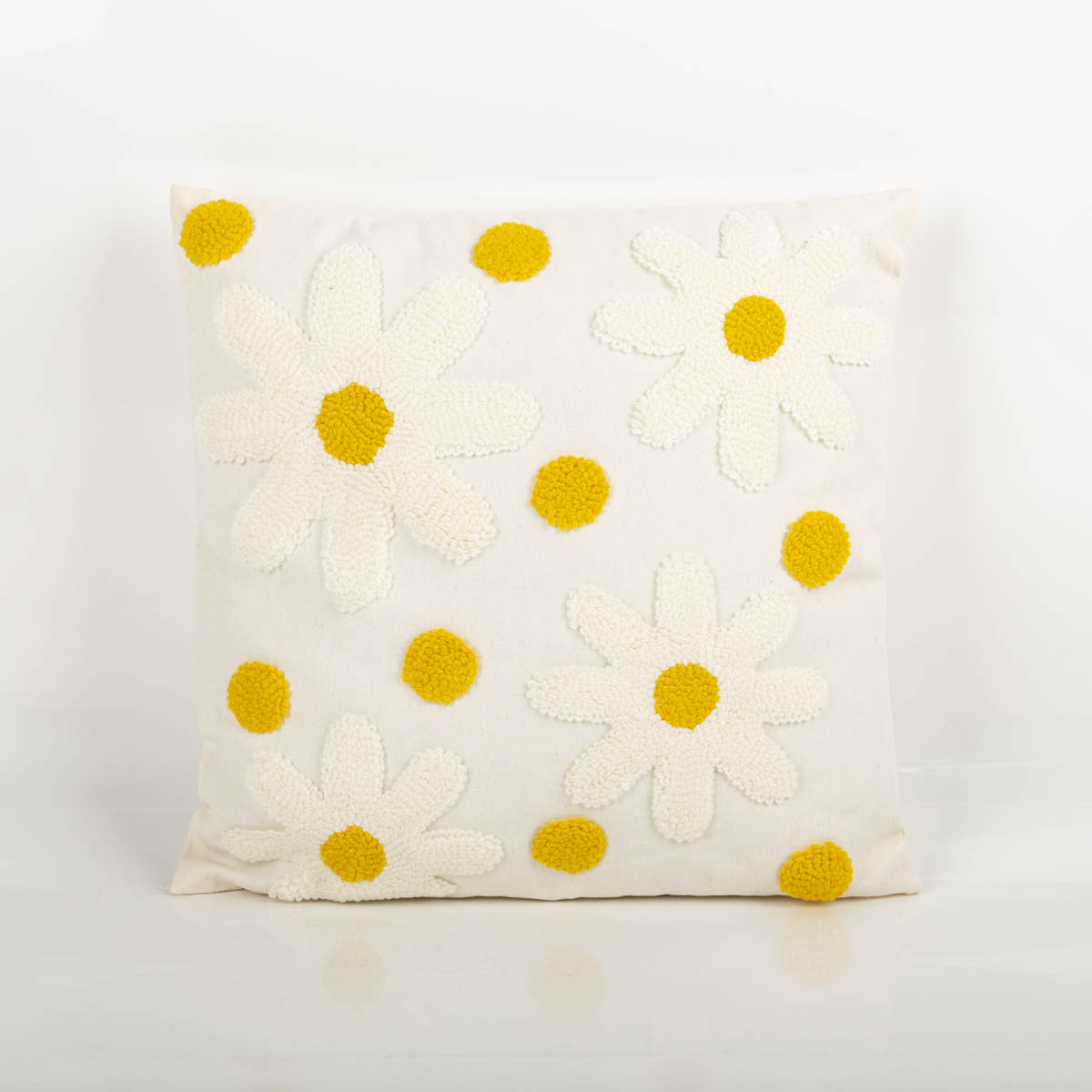 Kissen „Camille“ 45x45 cm: getuftete Blüten in wollweiß und gelb für einen natürlichen Look