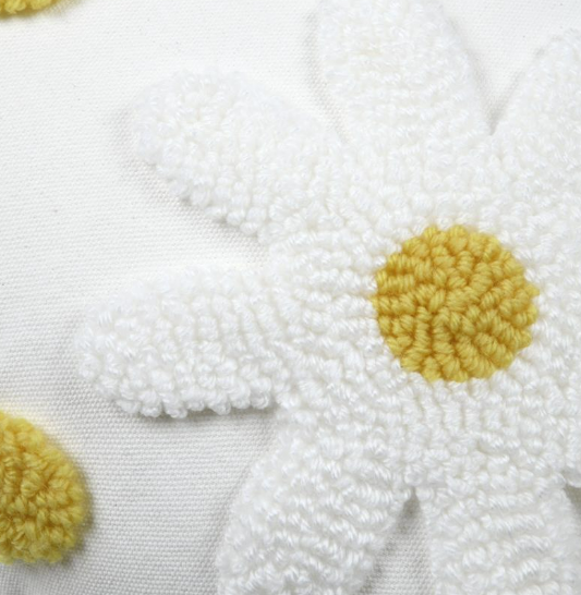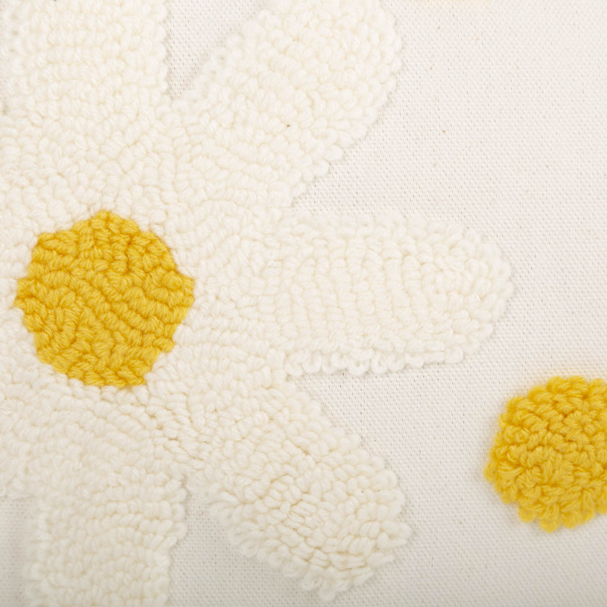 Getuftete Blüten: strukturierter Tufting-Look in wollweiß mit gelben Blütenmitten für einen natürlichen, wohnlichen Stil