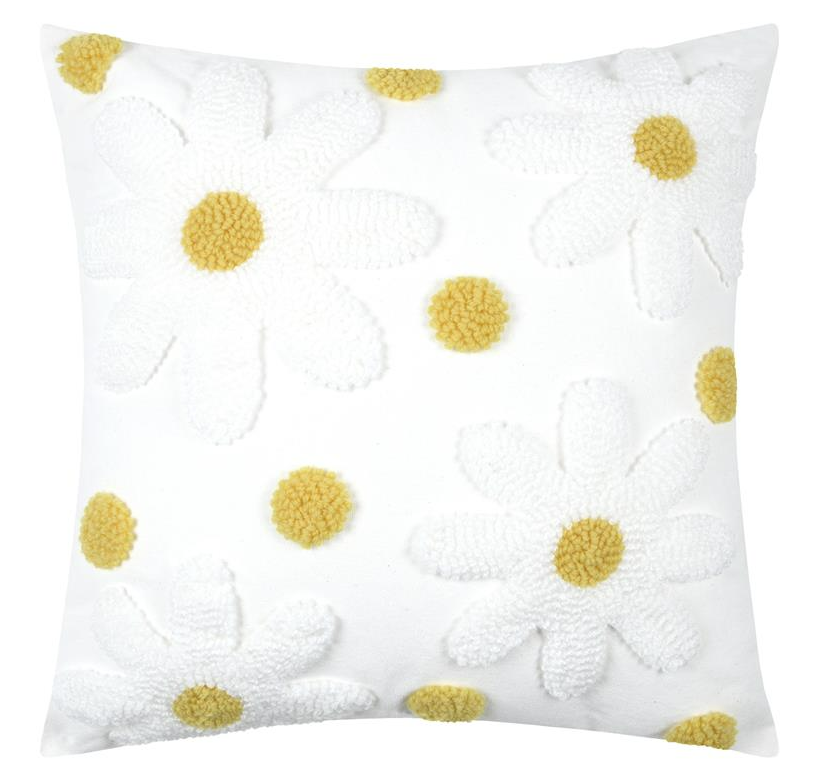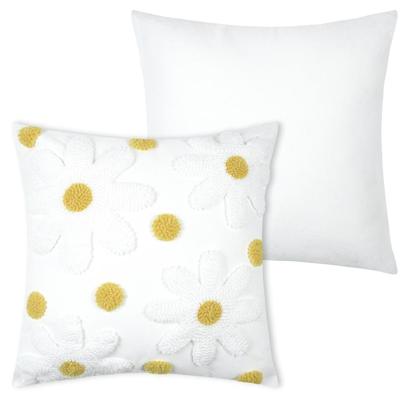 Du möchtest ein Kissen, das sofort nach Frühling, Leichtigkeit und gemütlichem Zuhause aussieht? Das Kissen Camille bringt getuftete Blüten in wollweiß mit sonnig gelben Blütenmitten auf eine ruhige Basis. Die strukturierte Tufting-Optik macht den Look lebendig und fühlt sich gleichzeitig angenehm weich an – perfekt, wenn du in deinem Wohnbereich natürliche Akzente setzen willst.