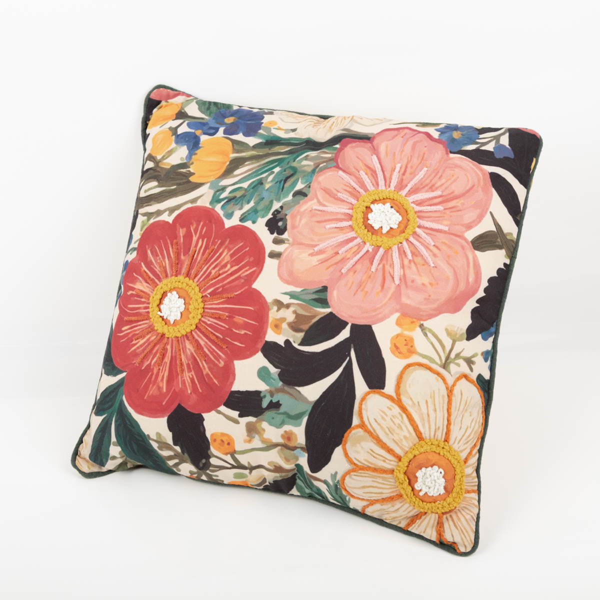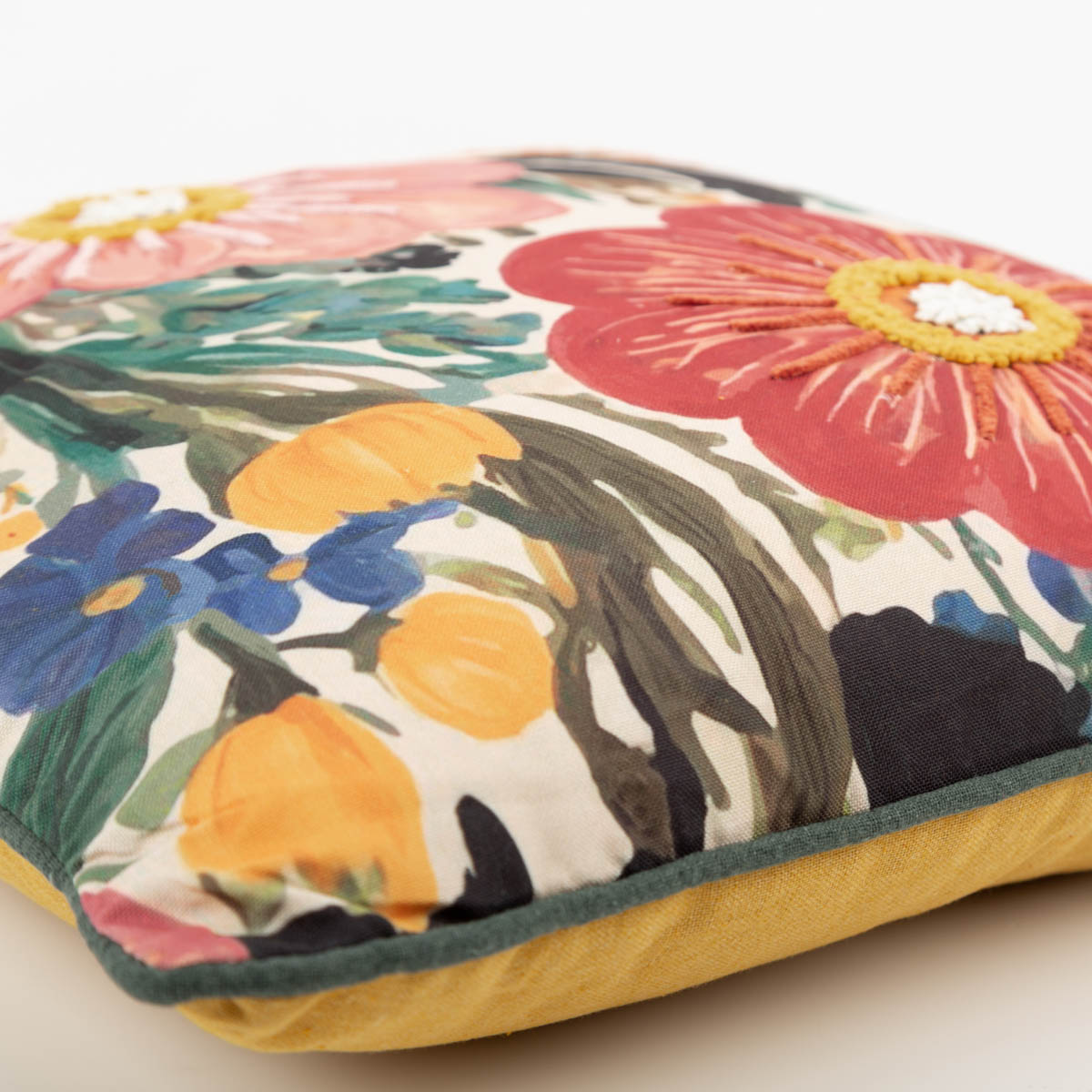 Das dekorative Canvas Kissen mit den Maßen 45x45 cm begeistert mit einem bunten, lebendigen Blumenmuster auf der Vorderseite. Das französische Floral-Dessin ist mit getufteten Akzenten veredelt – für eine edle Optik und fühlbare Struktur.