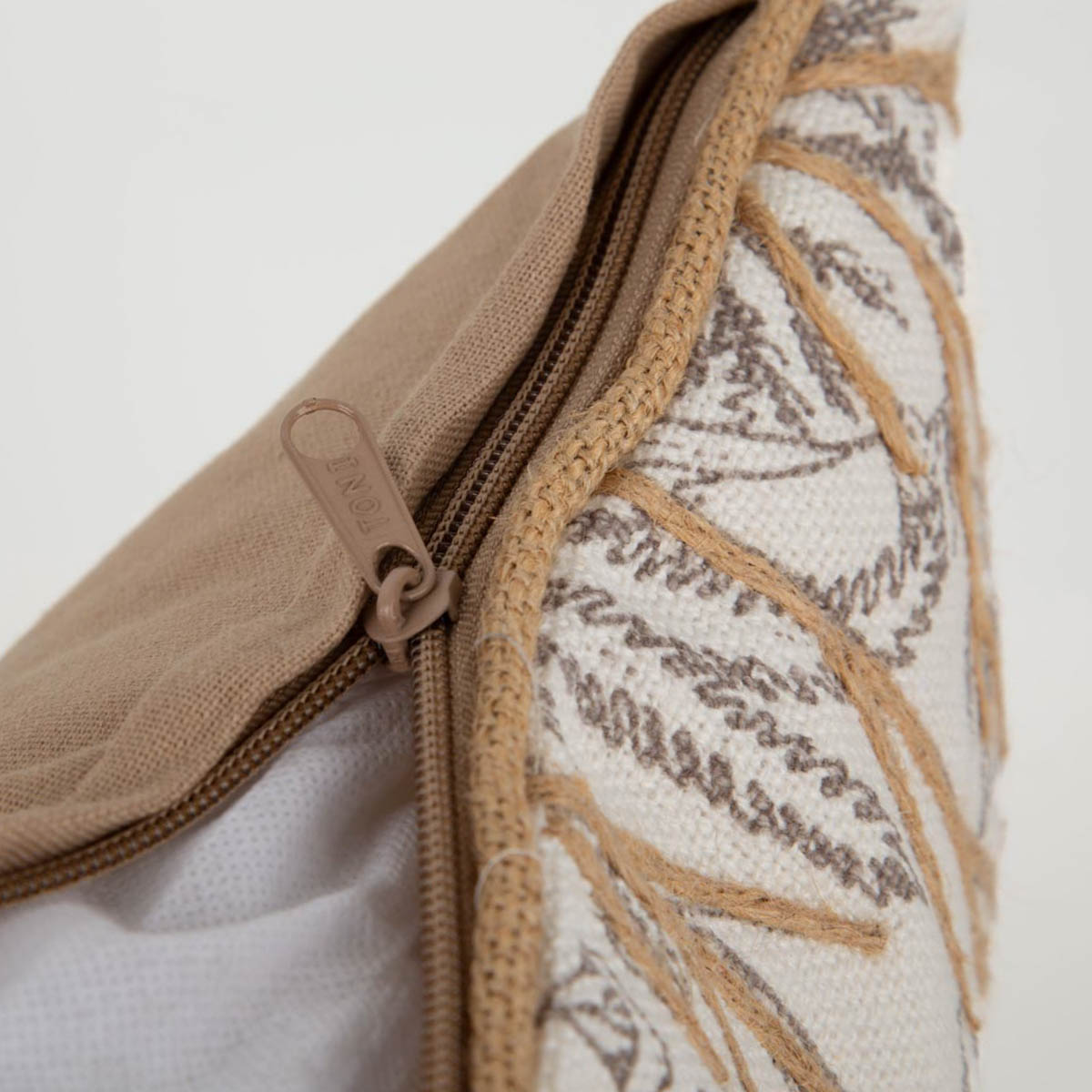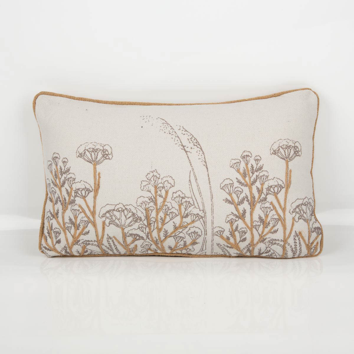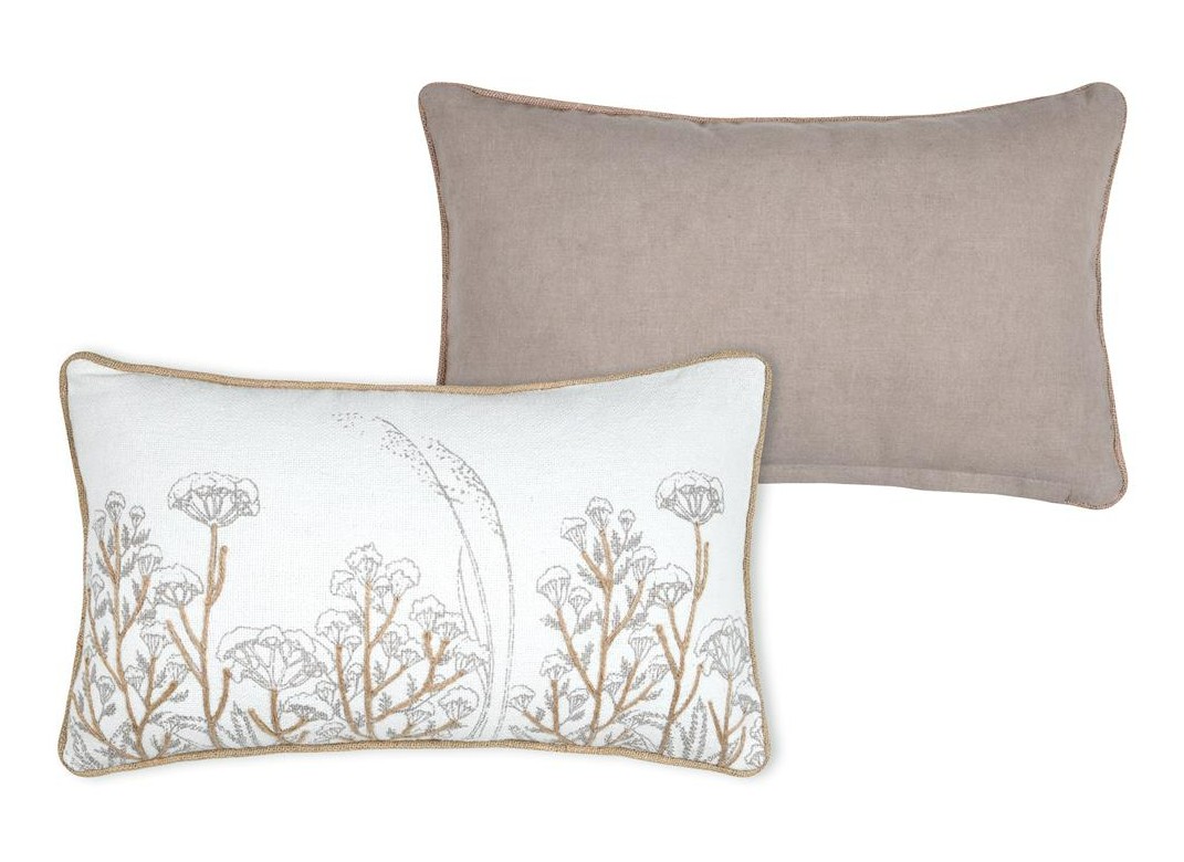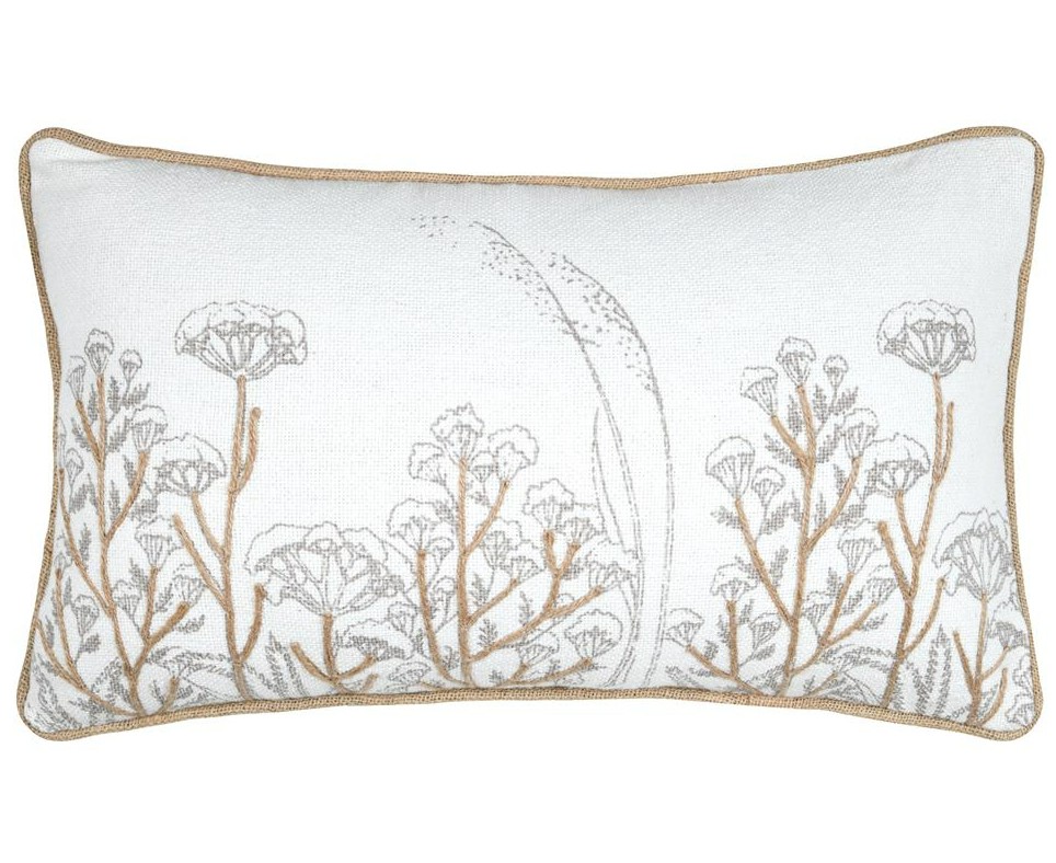 Du liebst natürliche Akzente? Dieses rechteckige Kissen bringt Ruhe und Leichtigkeit in dein Zuhause. Auf der weißen Vorderseite treffen dezente Blumen- und Gräsermotive auf applizierte Naturfaser-Details; die Kederumrandung in Natur setzt einen klaren Rahmen. Dank Reißverschluss auf der Unterseite lässt sich der Bezug schnell abnehmen – das Füllkissen ist schon dabei.