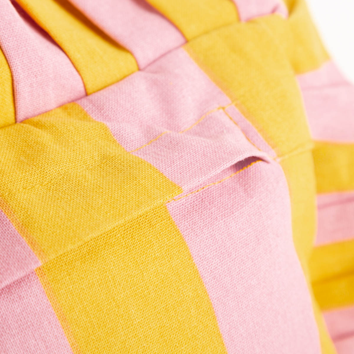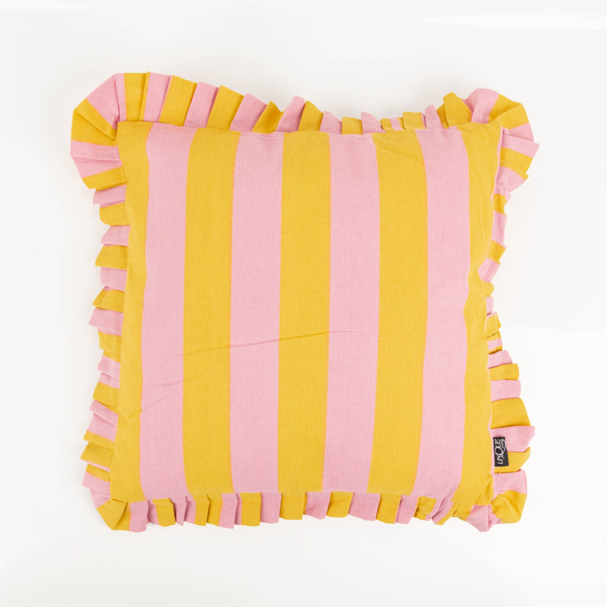 Das Kissen Summer Stripes mit Streifen & Rüschen in Gelb und Rosa 45x45cm –kombiniert modernes Design mit einer Prise Verspieltheit. Perfekt für Boho- & Kinderzimmer und eine tolle Geschenkidee!