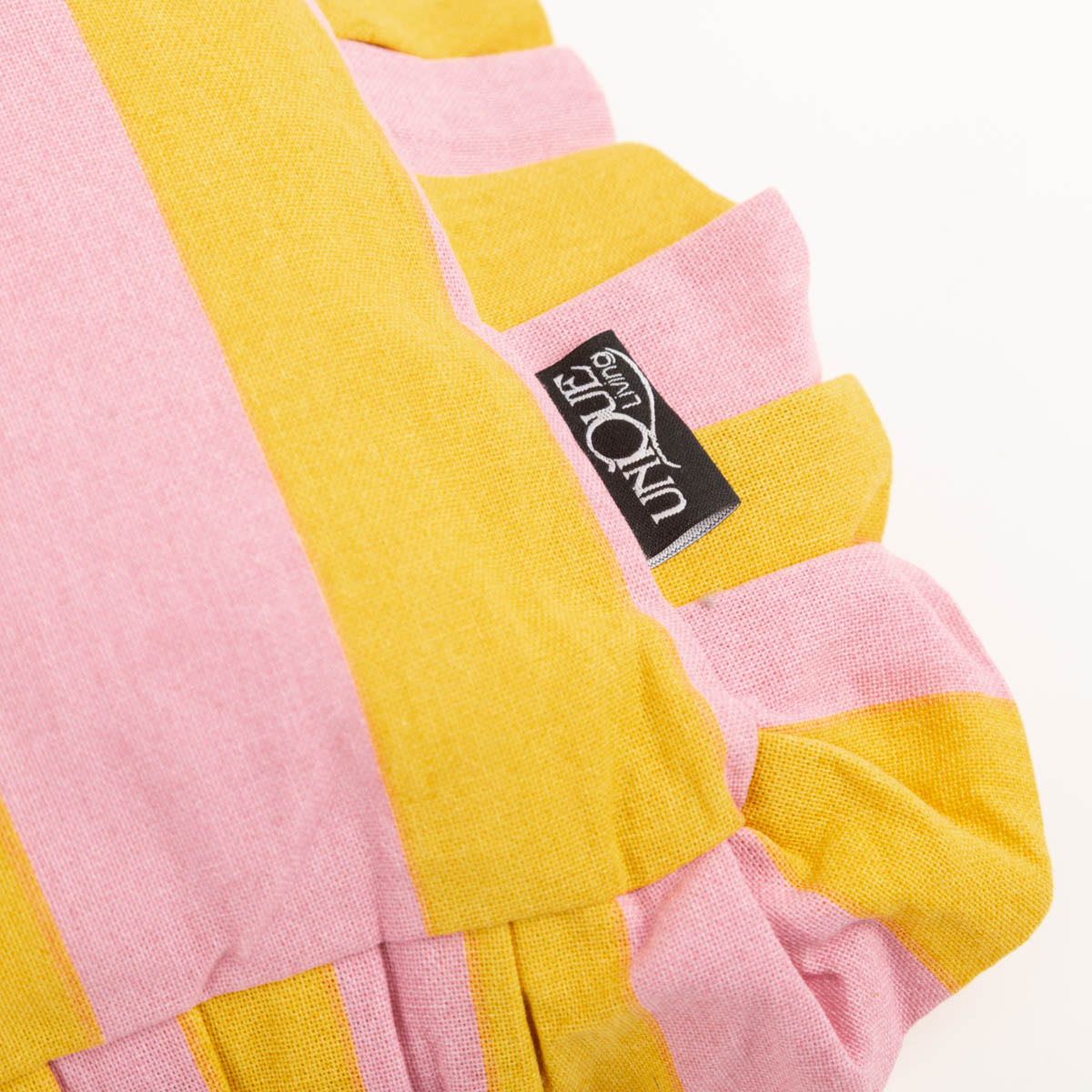 Modernes Dekokissen mit zarten Streifen in Gelb-Rosa und verspieltem Rüschenrand – ein echter Hingucker für dein Zuhause
