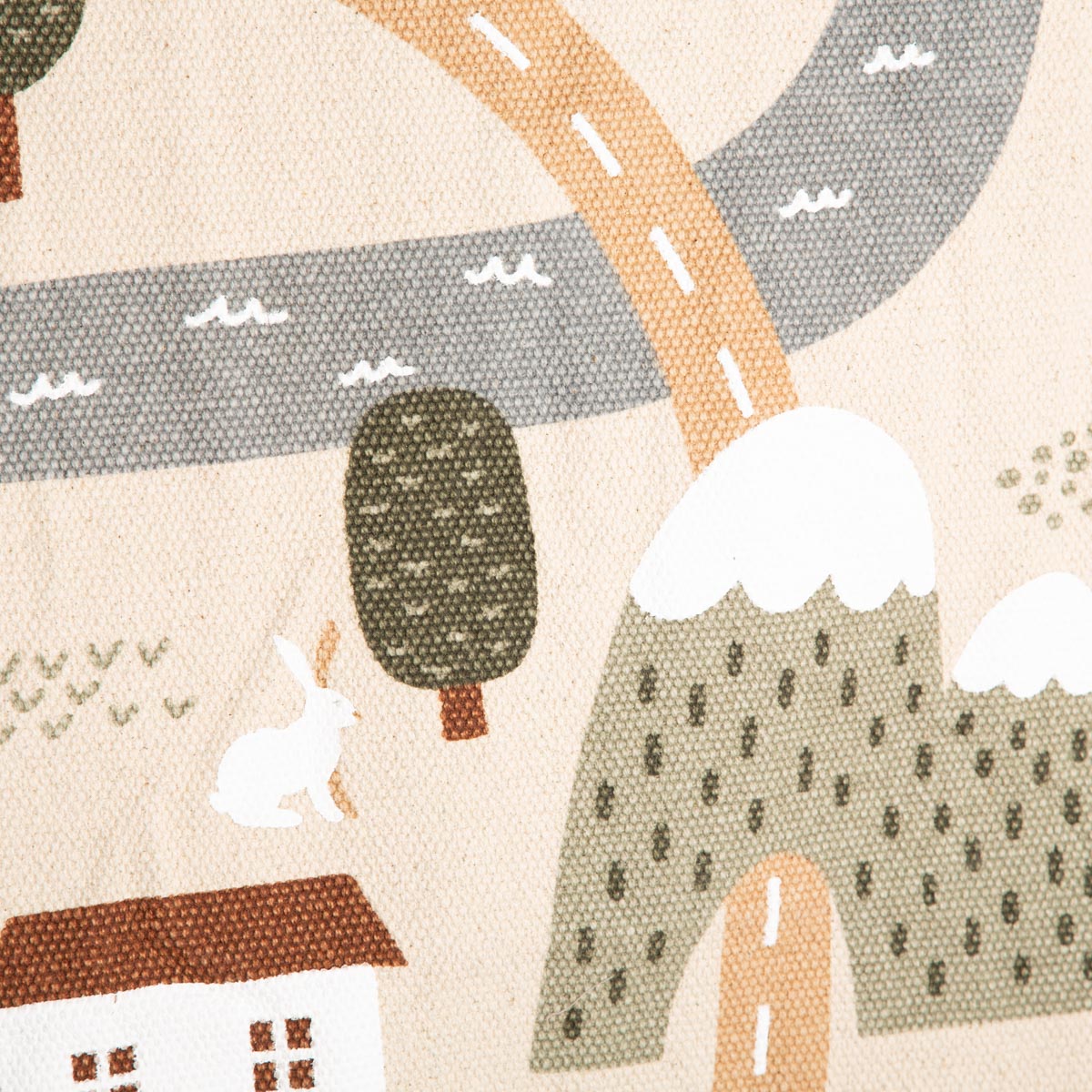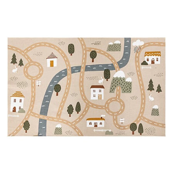 Dieser liebevoll gestaltete Spielteppich aus reiner Baumwolle verwandelt jedes Kinderzimmer in eine fantasievolle Spielwelt. Die Straßen, Häuser, Bäume, Flüsse, Berge und kleinen Tiere laden dein Kind dazu ein, eigene Geschichten zu erfinden und stundenlang mit Autos, Figuren oder Tieren zu spielen.