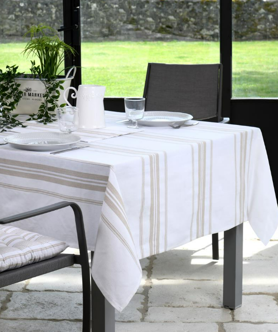 Durch das schlichte Streifenmuster und die hellen Naturtöne passt die Tischdecke hervorragend zu: