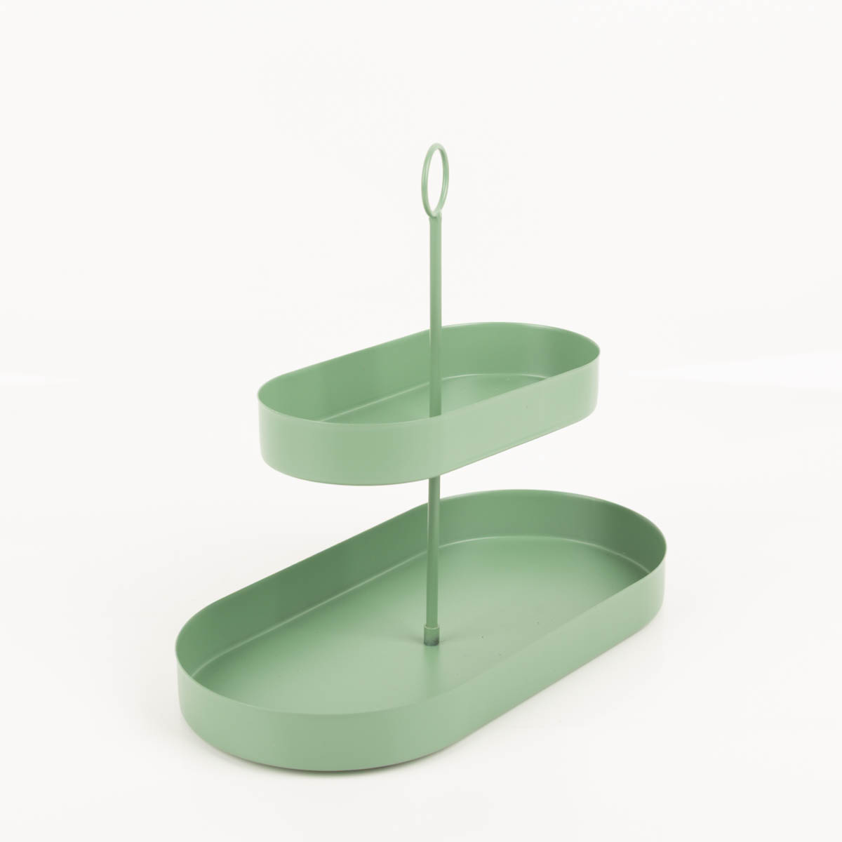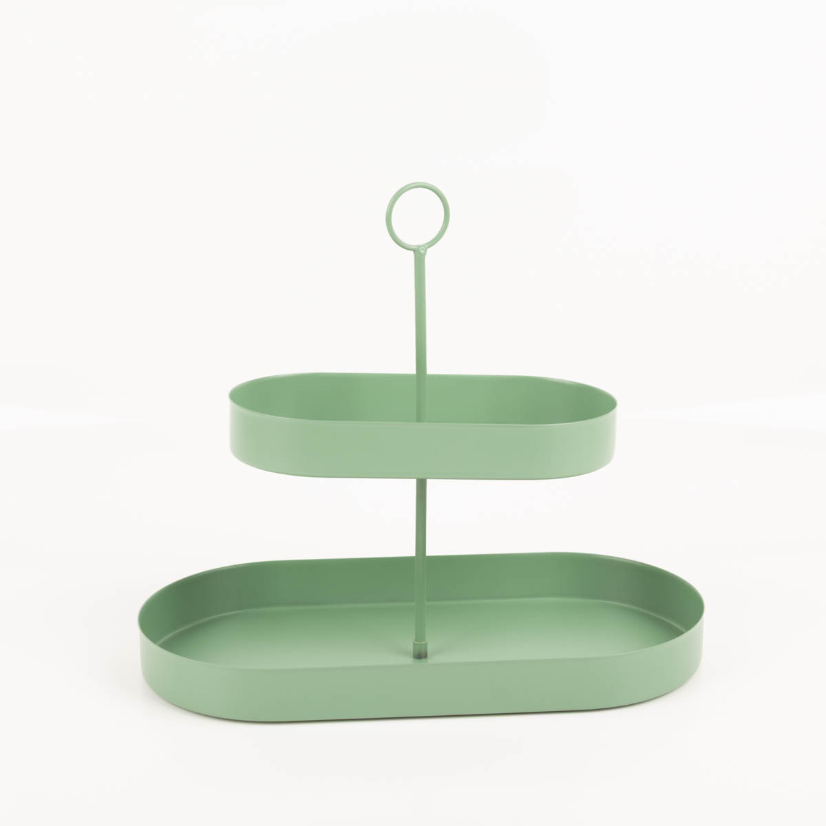 Mit dieser zweistufigen Etagere bringst du Ordnung, Übersicht und eine frische Farbnote auf deinen Tisch. Die ovale Form, das matte Grün und das klare Design machen sie zu einer schönen Ergänzung für Küche, Esszimmer und Wohnbereich. Ob du Obst, Gebäck, Pralinen, Snacks oder kleine Dekorationen präsentieren möchtest: Diese Etagere setzt deine Auswahl dekorativ und platzsparend in Szene.