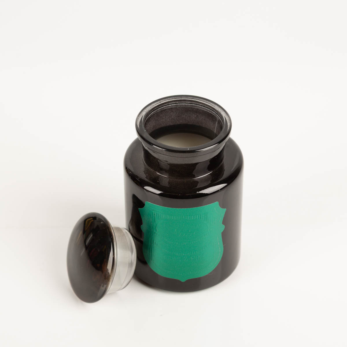 Die Duftkerze wird aus Sojawachs gefertigt und befindet sich in einem schweren Glasgefäß im klassischen Apothekerdesign. Das dunkle Glas unterstreicht den edlen Charakter und macht die Kerze auch unangezündet zu einem stilvollen Wohnaccessoire.