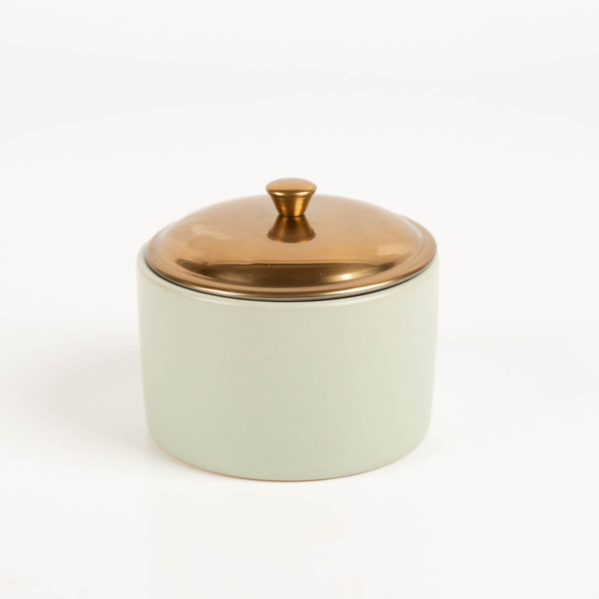 „Hygge“ steht für bewusste Gemütlichkeit, Ruhe und Wärme im Alltag. Diese kleinere Variante der beliebten Hygge-Kollektion bringt genau dieses Gefühl auch in kompakter Form in dein Zuhause. Der matte Keramiktopf in Salbeigrün wirkt natürlich und ruhig, der Metalldeckel in Kupferoptik setzt einen eleganten Akzent.