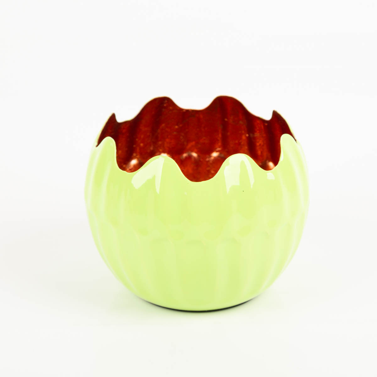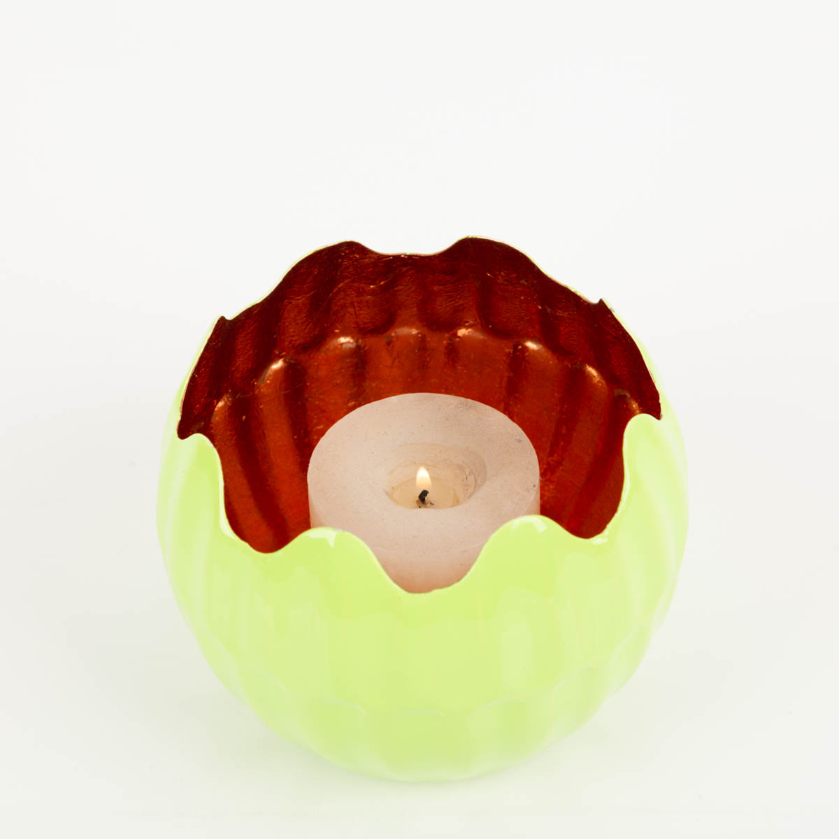Windlicht Holi Neon-Grün Kupfer 15x12 cm: großer Farbakzent mit warmem Kerzenlicht