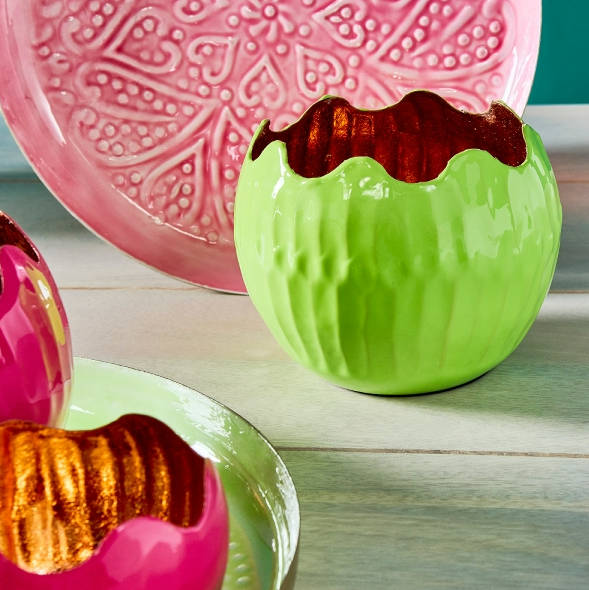 Mit dem Windlicht Holi von Werner Voss in der Größe 15x12 cm setzt du ein echtes Statement. Außen leuchtet Neon-Grün frisch und modern, innen reflektiert die kupferfarbene Oberfläche das Kerzenlicht besonders warm. Der geschwungene Bogenrand verleiht dem Windlicht seine charakteristische Form und macht es zum Blickfang auf Tisch, Sideboard oder Fensterbank.